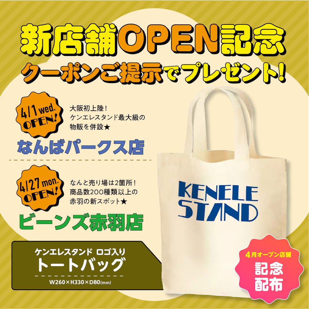 また、OPENを記念して、ケンエレファント公式アプリをダウンロードいただき、クーポンをご提示いただいた方を対象に、ケンエレスタンドのロゴ入りトートバッグをプレゼントいたします。