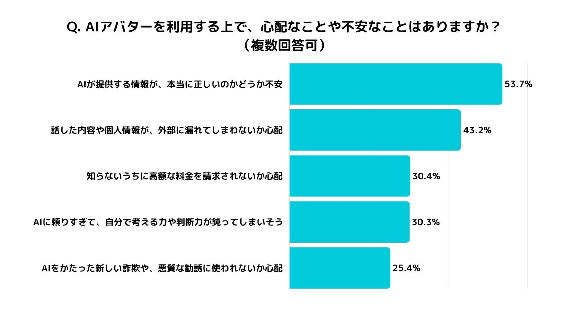AIアバターへの期待が示される一方で、その普及には大きな障壁が存在することも明らかになりました。実に、AIアバターの利用意向が「ない」層は68.3%に達しており、利用者が抱える強い不安を解消することが不可欠です。最大の不安は、「AIが提供する情報が、本当に正しいのかどうか不安」であり、過半数の53.7%がこれを指摘しています。「話した内容や個人情報が、外部に漏れてしまわないか心配」(43.2%)や「知らないうちに高額な料金を請求されないか心配」(30.4%)も普及を妨げる一因として挙げられました。