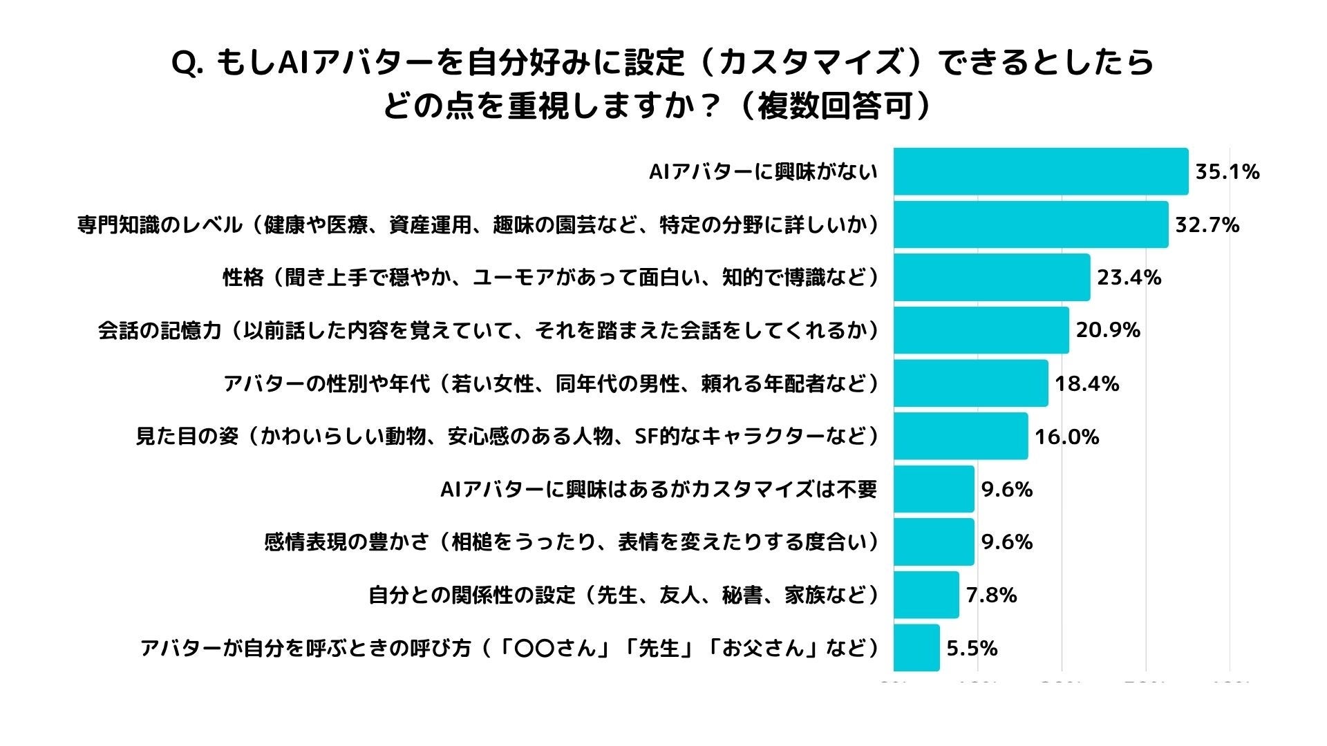 高齢者が求めるのは単なる雑談相手ではなく、専門的な知識によるサポートです。AIアバターのカスタマイズで最も重視される要素は、アバターの見た目よりも「専門知識のレベル」(32.7%)でした。特に「金融機関や年金など、お金に関する少し難しい相談にのってくれる」(アドバイザー)機能への期待も20.9%にのぼりました。