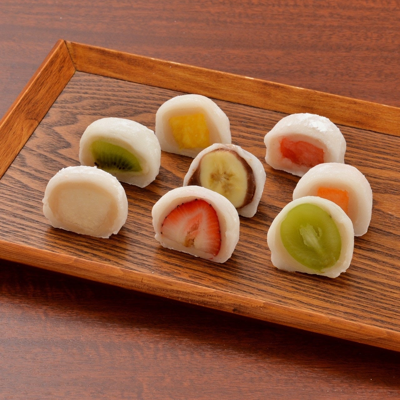 旬の果物を白餡と求肥で包み仕上げたフルーツ大福。旬の果物の香り、白餡の味、求肥の柔らかい食感のマリアージュを楽しめます。フルーツをイメージしたカラフルな個包装はギフトにもぴったりです。