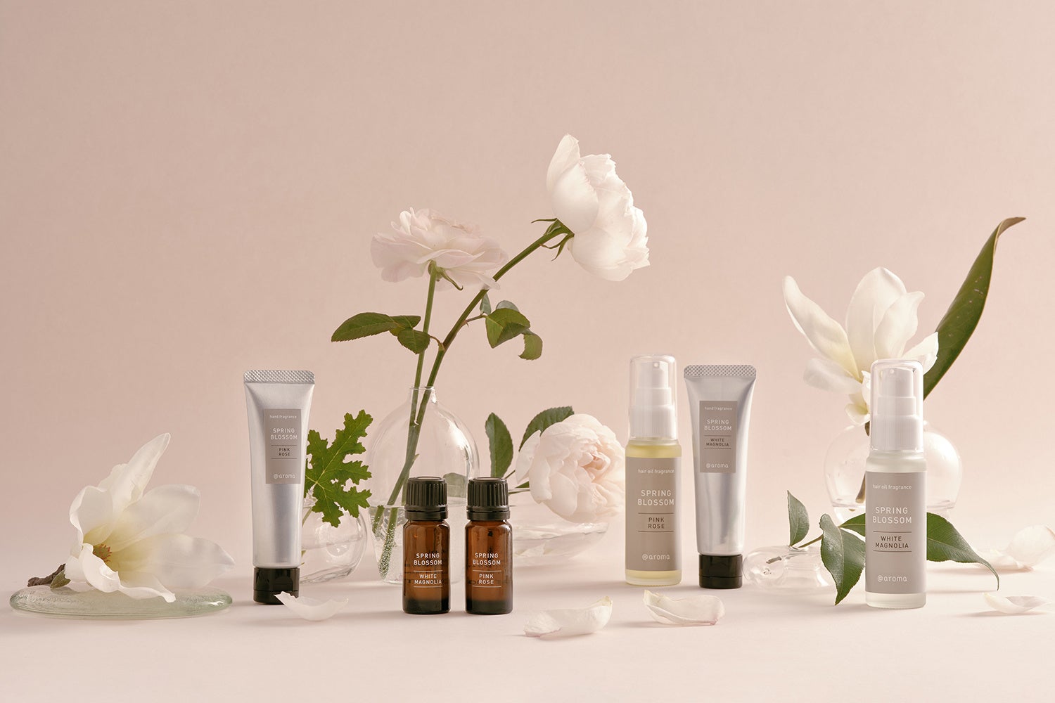 あたたかな陽気に包まれ、優雅で美しい花々が咲きほころぶ春。春の花「ローズ」と「マグノリア」は、愛や幸福などの前向きで幸せなイメージをもつことから世界中で愛され、その上質な香りは香水などでも親しまれています。「スプリングブロッサム」シリーズは100%天然のエッセンシャルオイルのみを使用し、「ローズ」と「マグノリア」の花々が咲きほころぶ情景を香りでデザインしています。