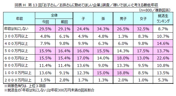 子・孫に稼いでほしいと考える最低年収を調査したところ、「年収は気にしない」(回答率29.5%)が約3割を占める反面、「500万円以上」(同15.9%)、「600万円以上」(同 15.5%)など、全体の57.9%が、民間企業の平均年収460万円(2023年版「民間給与実態統計調査」)を超える年収を最低年収として求めていることが明らかとなりました。その点は、2024年3月に就職活動生向けに実施した「第10回就職したい企業・業種ランキング」(就活生ランキング)の結果とも共通しており、本人、父母・祖父母ともに、人並み以上の生活水準を望んでいることが浮き彫りとなりました。(図表H)