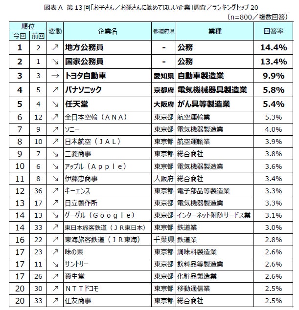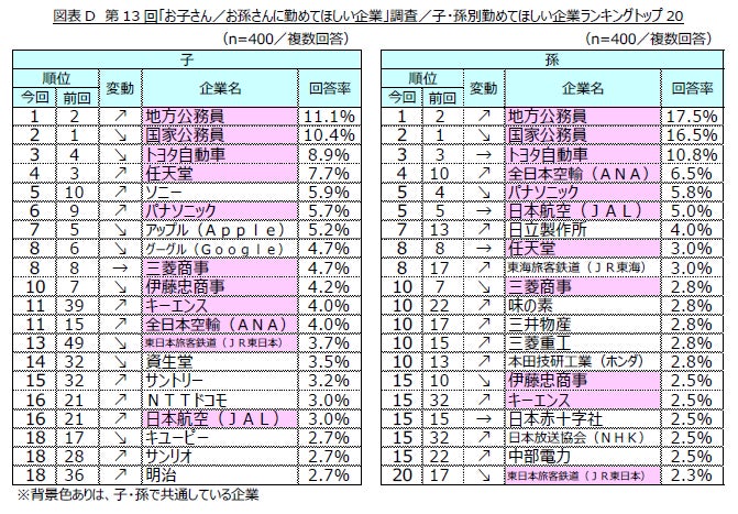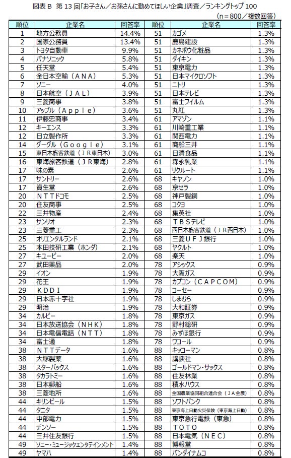 第13回「お子さん/お孫さんに勤めてほしい企業」調査のランキング1位は「地方公務員」(回答率14.4%)となりました。次いで2位「国家公務員」(同13.4%)、3位「トヨタ自動車」(同9.9%)、4位「パナソニック」(同5.8%)、5位「任天堂」(同5.4%)、6位「全日本空輸(ANA)」(同5.3%)、7位「ソニー」(同4.0%)、8位「日本航空(JAL)」(同3.9%)、9位「三菱商事」(同3.8%)、10位「アップル(Apple)」(同3.6%)と続きました。