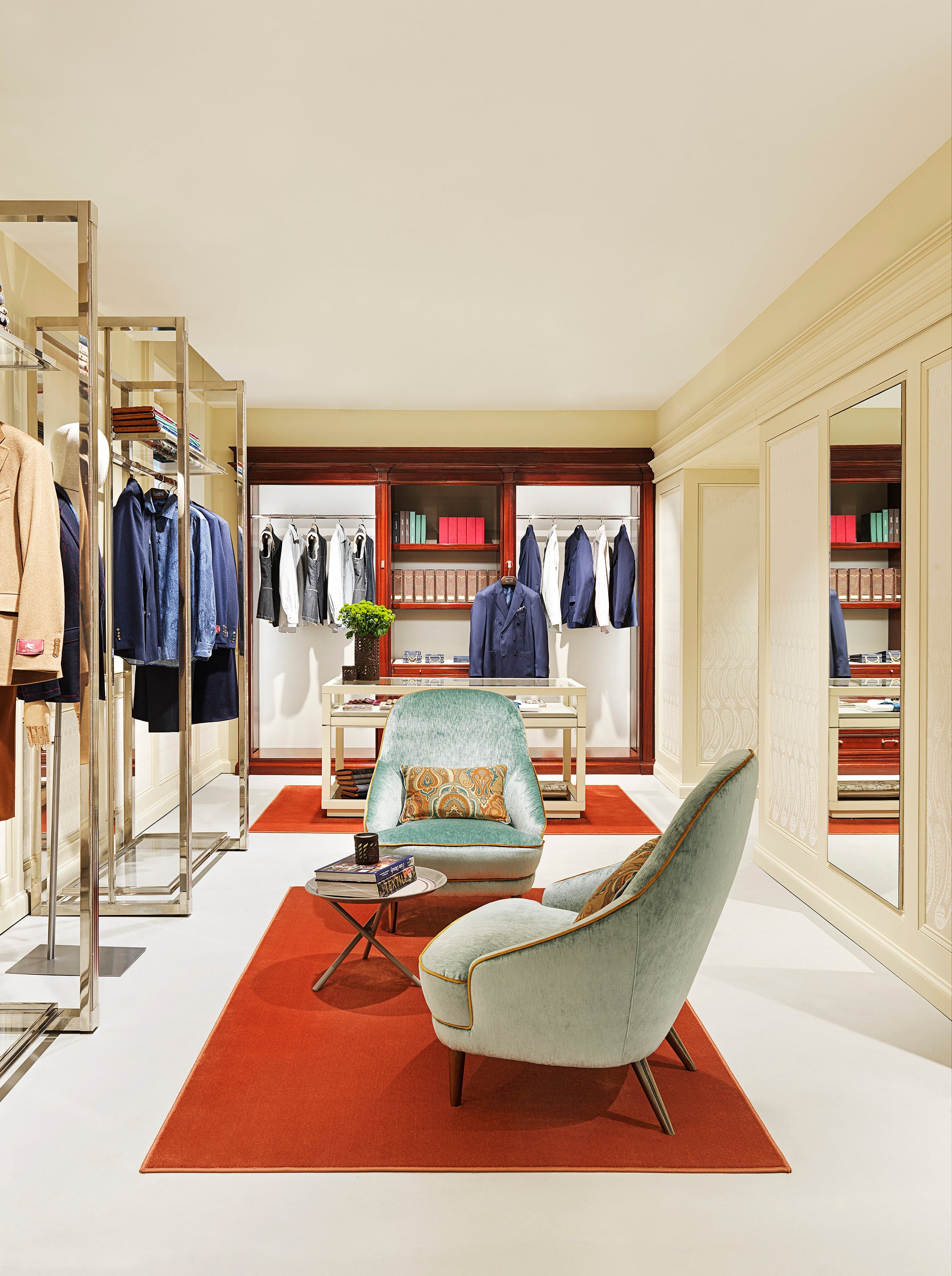80種類のファブリック、45種類の裏地、34種類のネクタイ裏地、9種類のカラークロス用メルトン、28種類のボタンから、お好みのスタイルを選んで組み合わせることができます。また、エトロのファブリック以外にも、パートナーである、英・ドメール社、伊・ピアチェンツァ社、伊・ドラゴ社、英・ホーランド&シェリー社など、世界的な高級ファブリックメーカーが提供する様々な素材もラインナップされています。