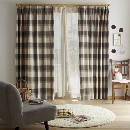 ■特徴: 先染め糸で織り上げたチェック柄が印象的なナチュラルカーテン。遮光のない素材感のある生地で、やさしい自然光を取り入れます。