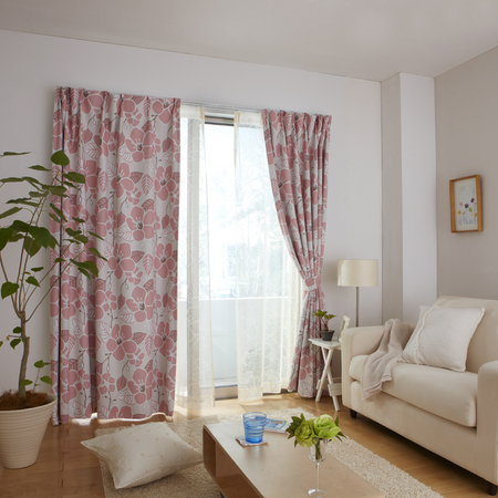 ■特徴: 華やぐ大花モチーフの遮光カジュアルプリントカーテン。爽やかな色目でお部屋を明るく演出します。また、遮光付きでほどよく外からの光を遮ります。