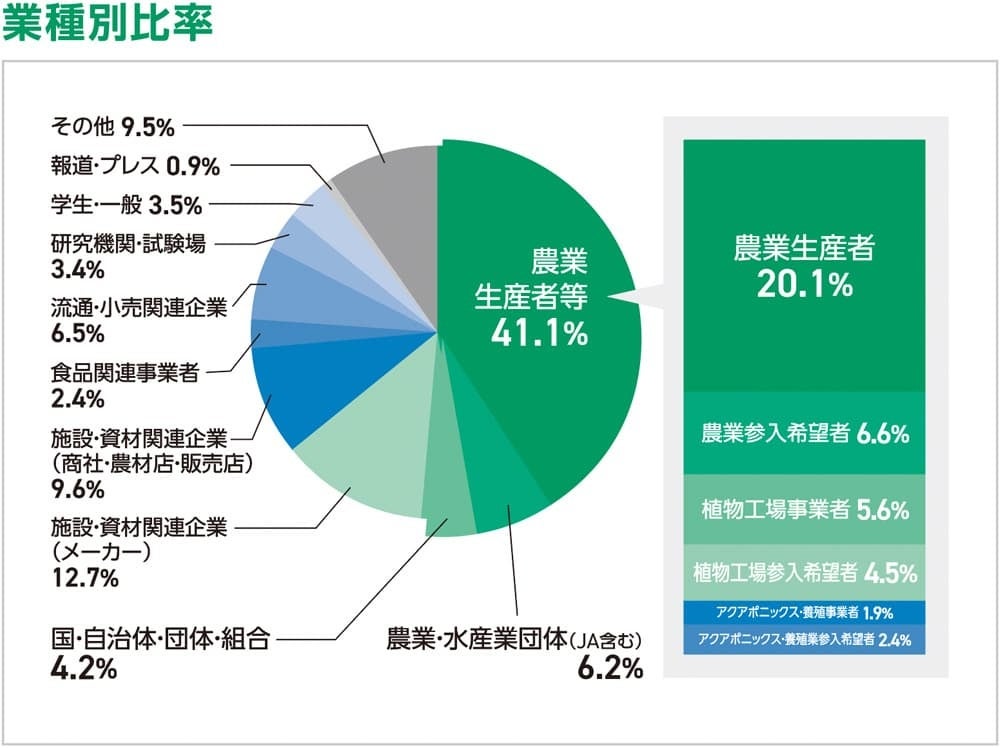 本展は園芸資材メーカー、販売会社を中心に構成される(一社)日本施設園芸協会が主催する、業界での知名度と生産者への動員力を持った展示会です。施設園芸の農閑期となる7月に開催し、前回は16,261名の来場者(うち4割が農業生産者の来場)を獲得しています。また、会期中に来場者との商談があった出展者は8割を超え、出展製品・サービスのエンドユーザーへの効率的なPRを後押しします。