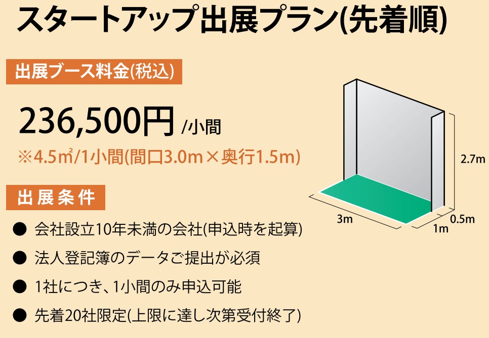 施設園芸・植物工場にかかわる製品・技術・サービスを保有している設立10年未満の会社を対象とし、「スタートアップ出展プラン」をご用意しています。スタートアップ企業・団体の皆さまのご参加をお待ちしております。枠数は残り僅かとなっておりますので、ご検討の場合はお早めに事務局までご連絡ください。