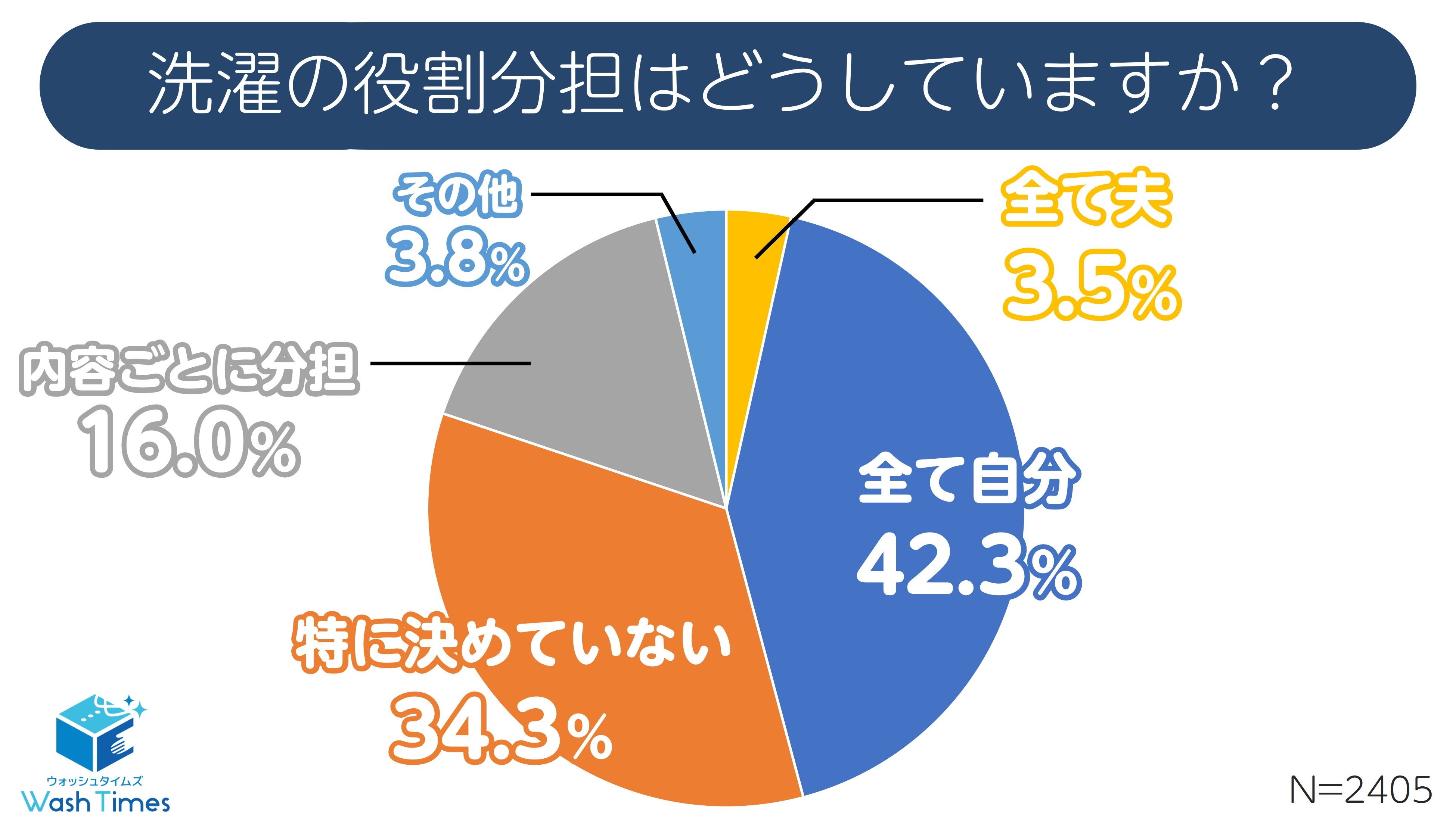 「どちらがやるかは特に決めていない」と回答した人は34.3%、「洗い・たたむなど内容ごとに分担している」と回答した人は16.0%という結果でした。