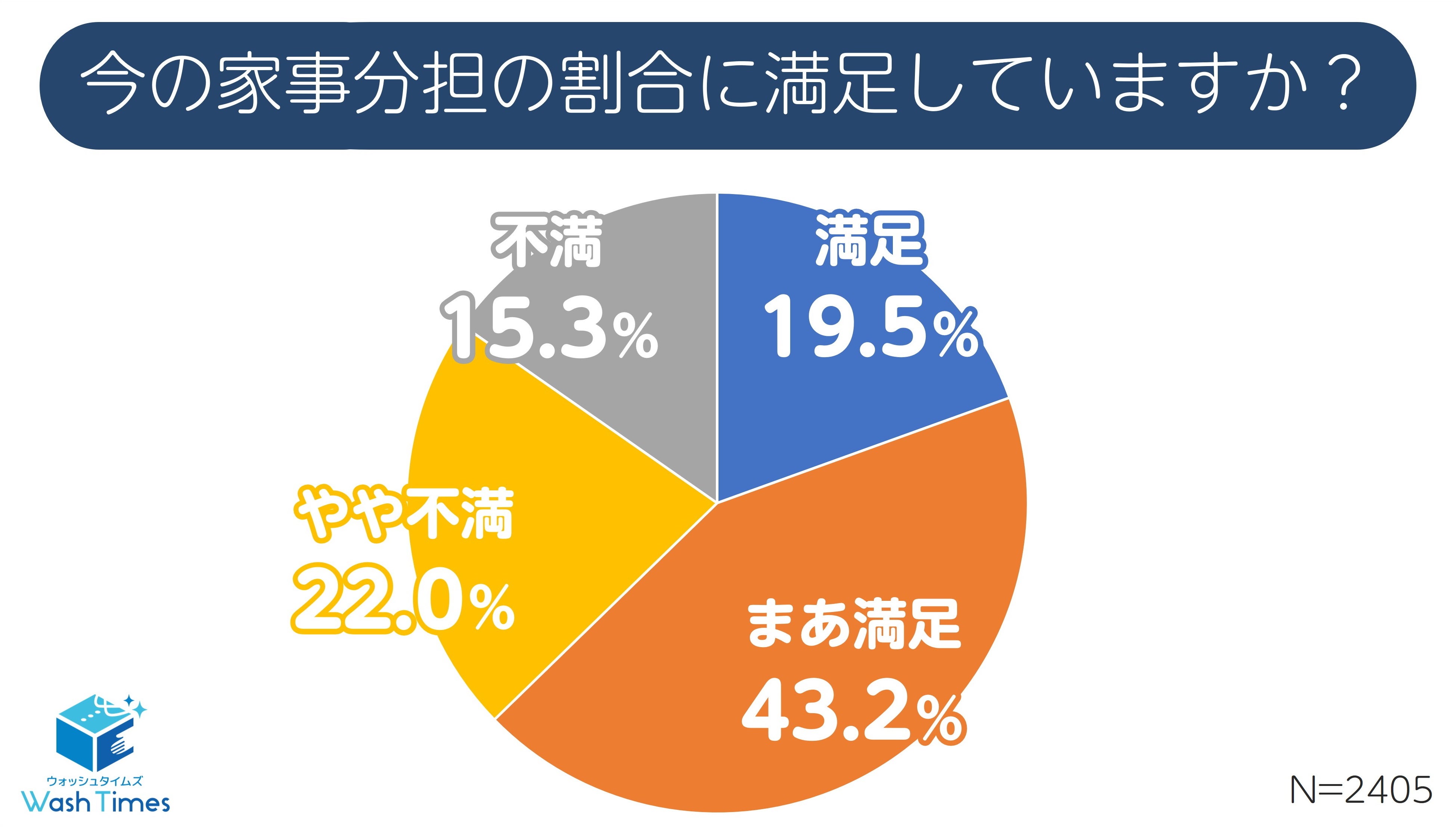 今の家事分担の割合に「満足」と回答した人は19.5%、「まあ満足」と回答した人は43.2%と満足側が多い結果に。