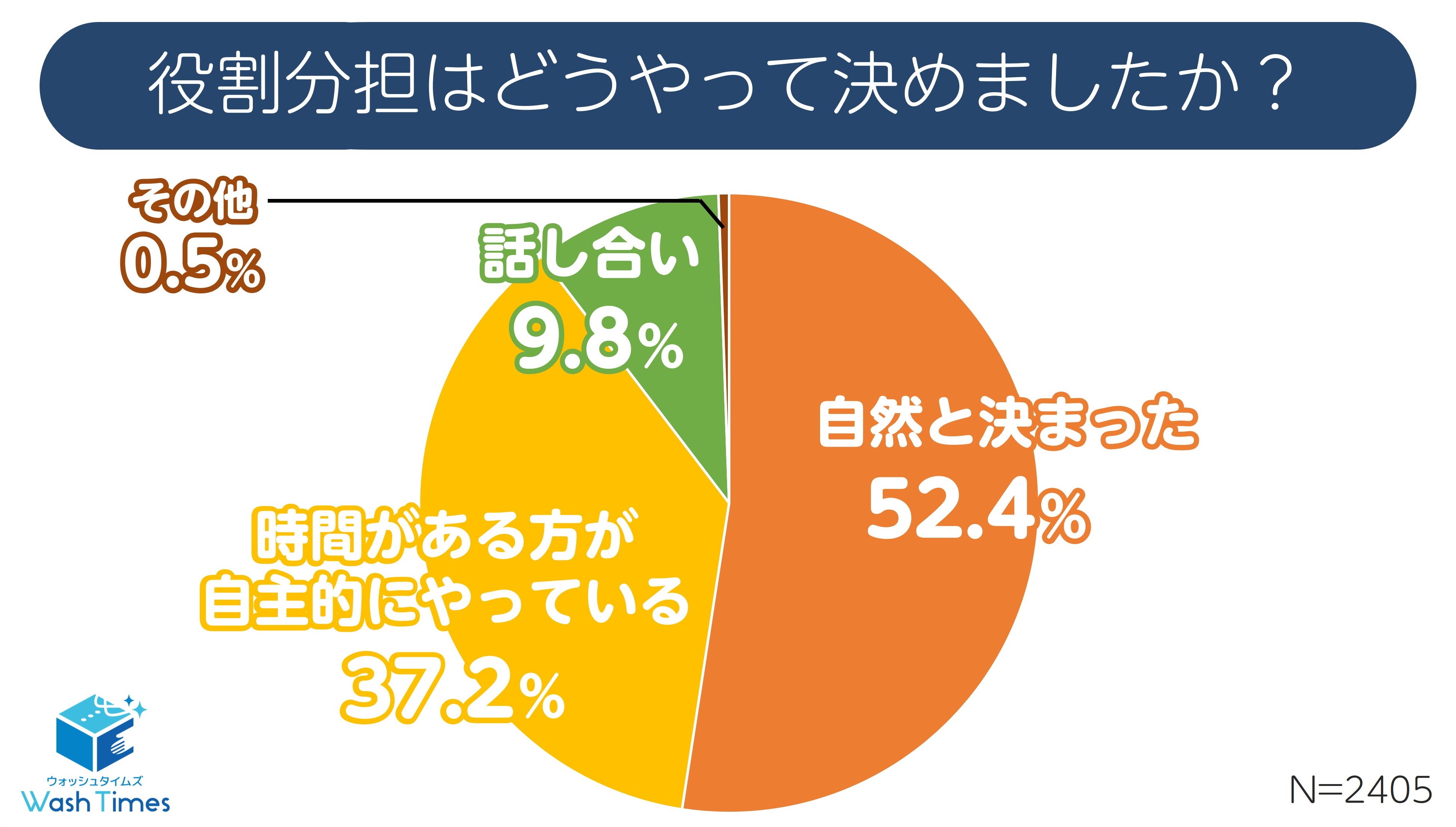 家事担当の決め方については、話し合いではなく自然と決まる夫婦が多く、役割分担に満足している方が過半数を占める結果となりました。