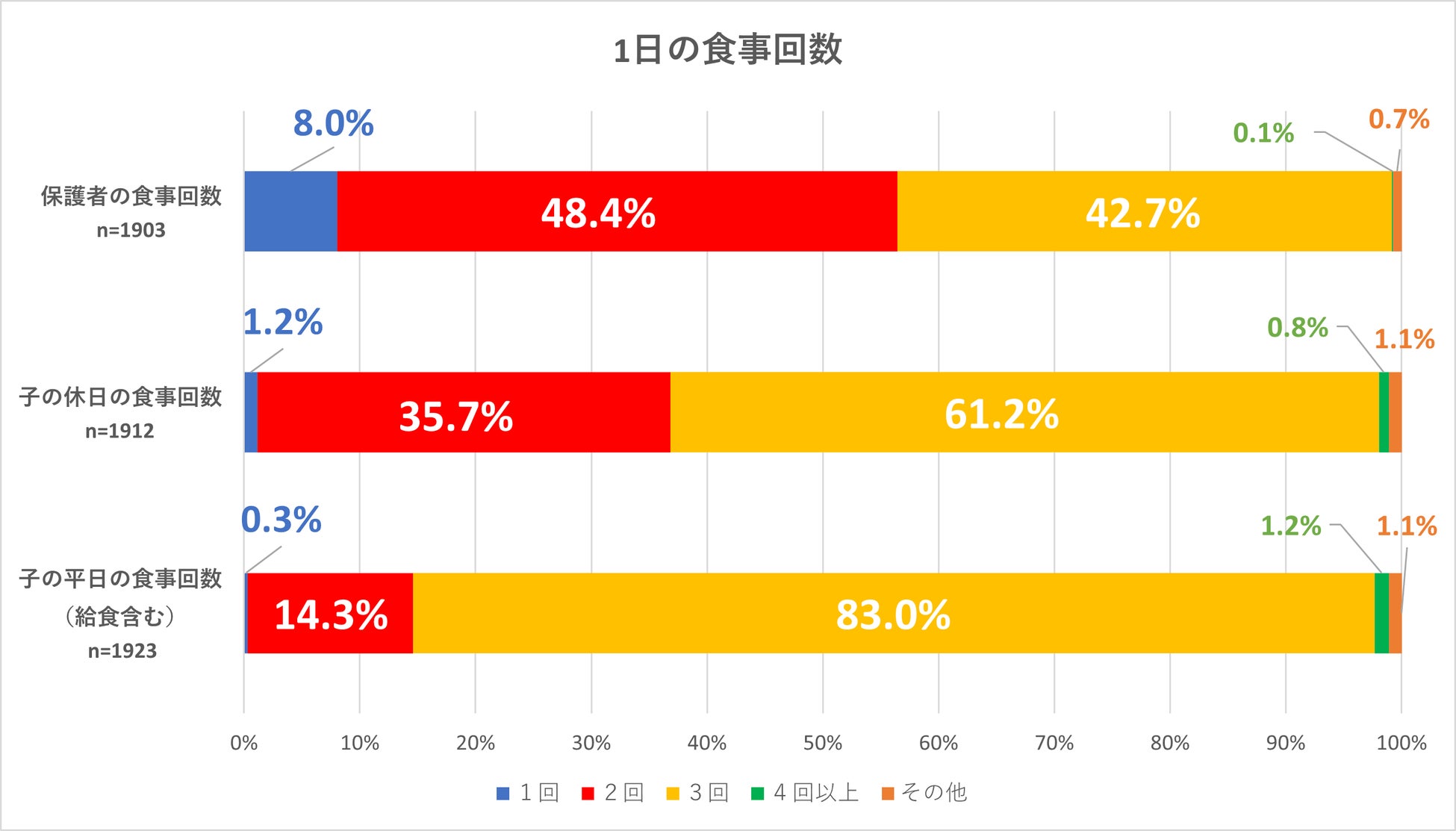 休日は、1日2食の子どもが平日の2倍以上にあたる35.7%に上り、さらに、全体の1.2%にあたる22人の子どもは1日1食のみの生活を送っています。