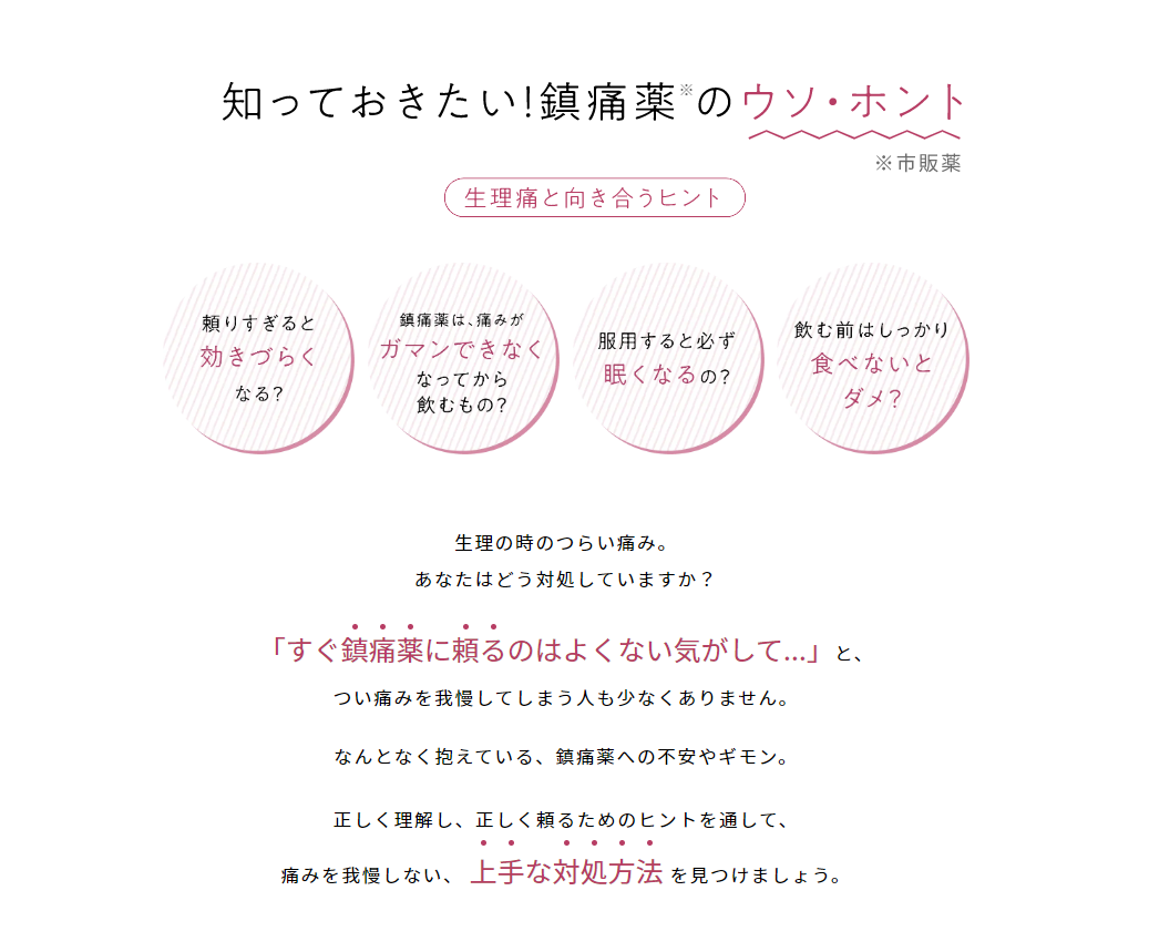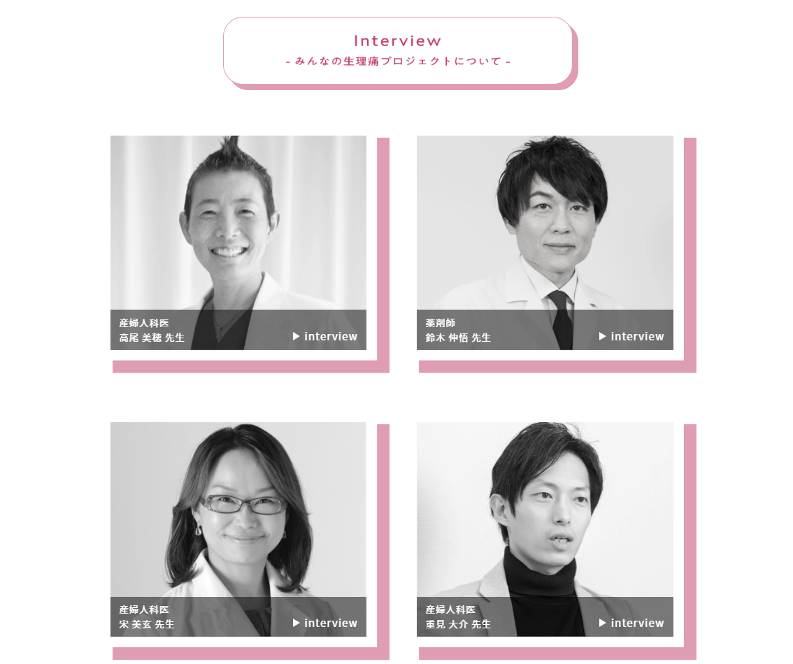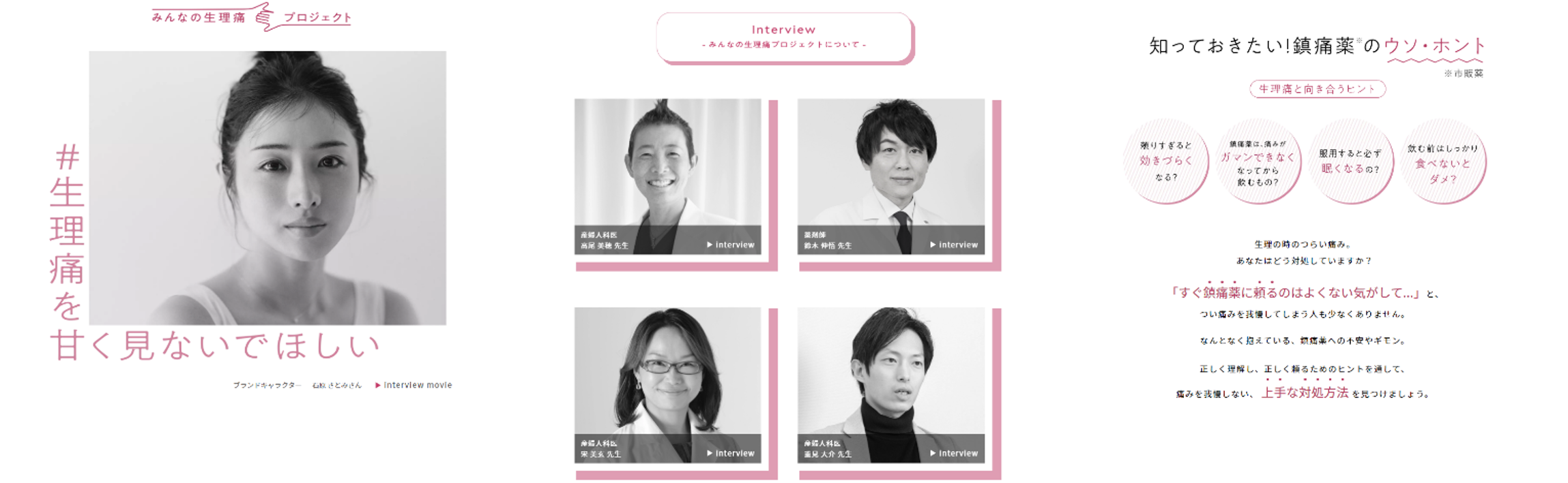 プロジェクトサイトではより多くの方に生理痛への理解を深めていただくために、医師・薬剤師のインタビューや鎮痛薬に関する不安解消のための情報などを発信いたします。また今後も継続して多様なコンテンツを拡充予定です。
