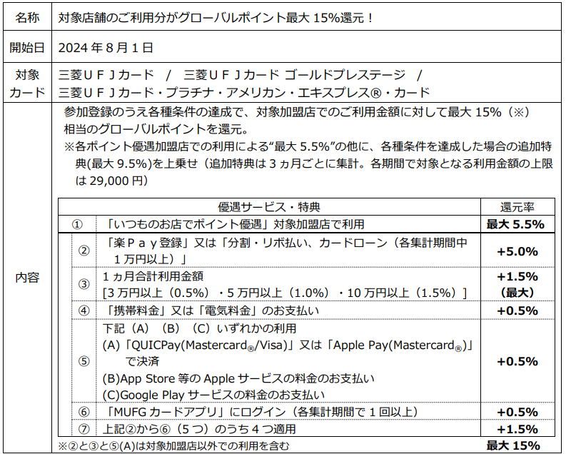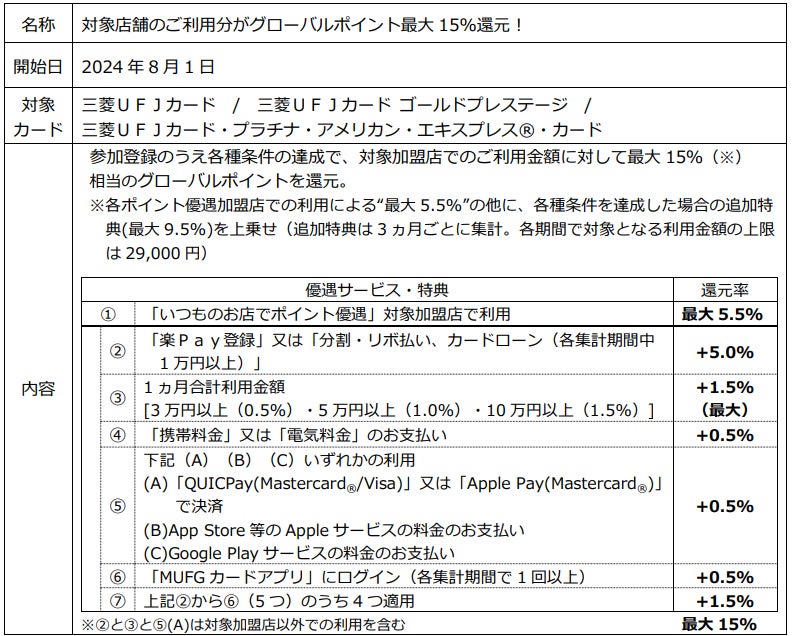 なお、当社では今回のポイント優遇加盟店の拡大に合わせて、対象加盟店での同カードの利用や各種サービスの登録・利用等に応じて、最大5.5%に更に上乗せした最大15%相当(※1)のポイントが貯まるお得な企画(詳細は別紙参照)を用意、8月1日より参加登録を受け付けます。さらに、今年度中には、“MUFGを使うほどお得になる”新ポイントアッププログラムを開始予定です。当社は今後も、お得な特典やサービスの拡充により、「三菱UFJカード」を一層進化させていきます。