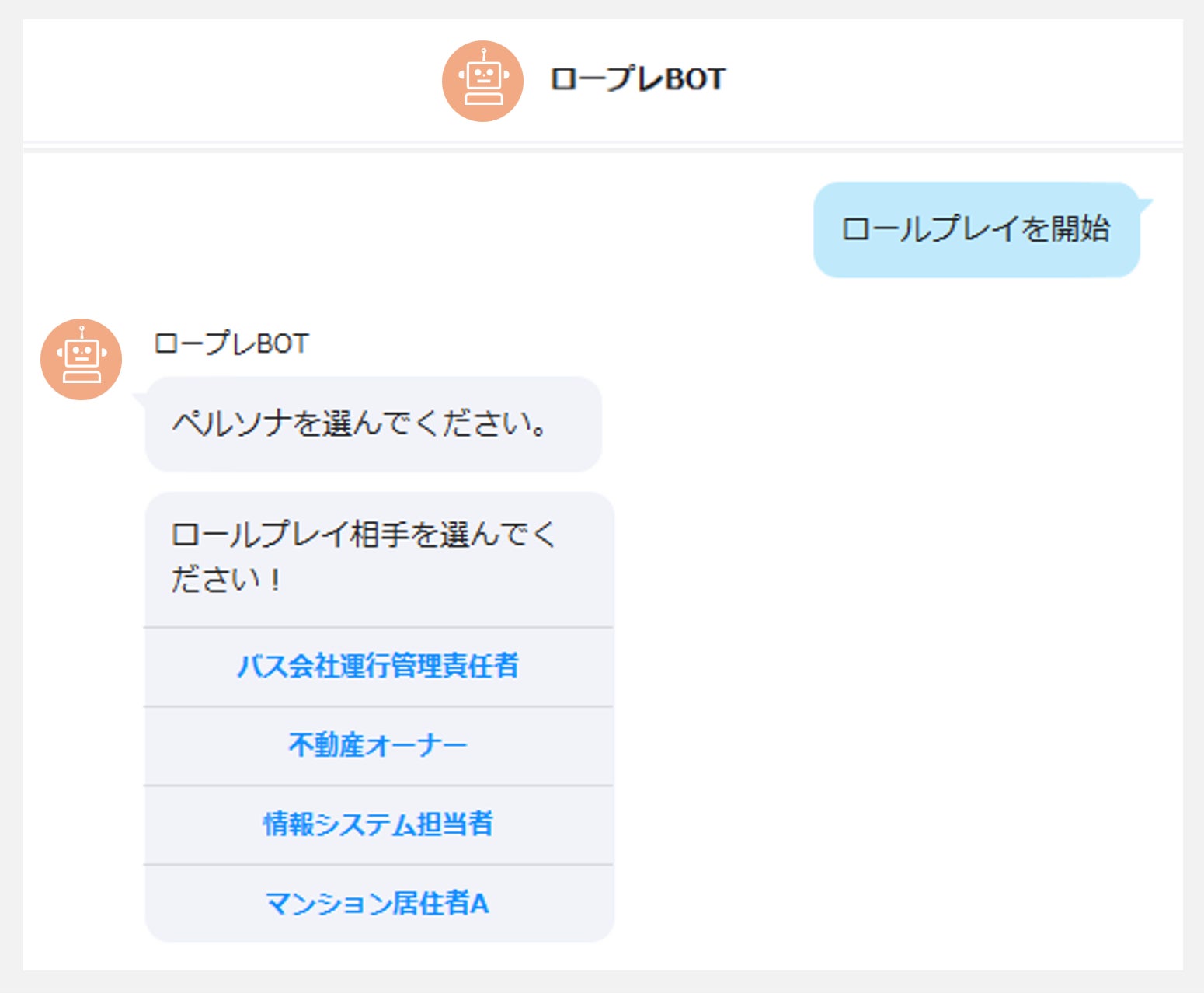 普段利用している社内チャットツールでBotをチャットルームに追加し、メニューから「ロールプレイを開始」を選ぶだけで簡単に利用可能です。