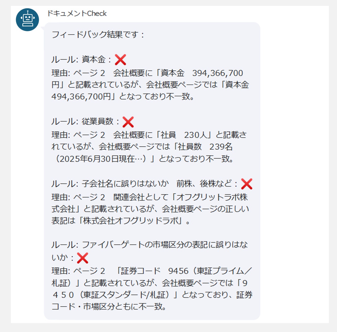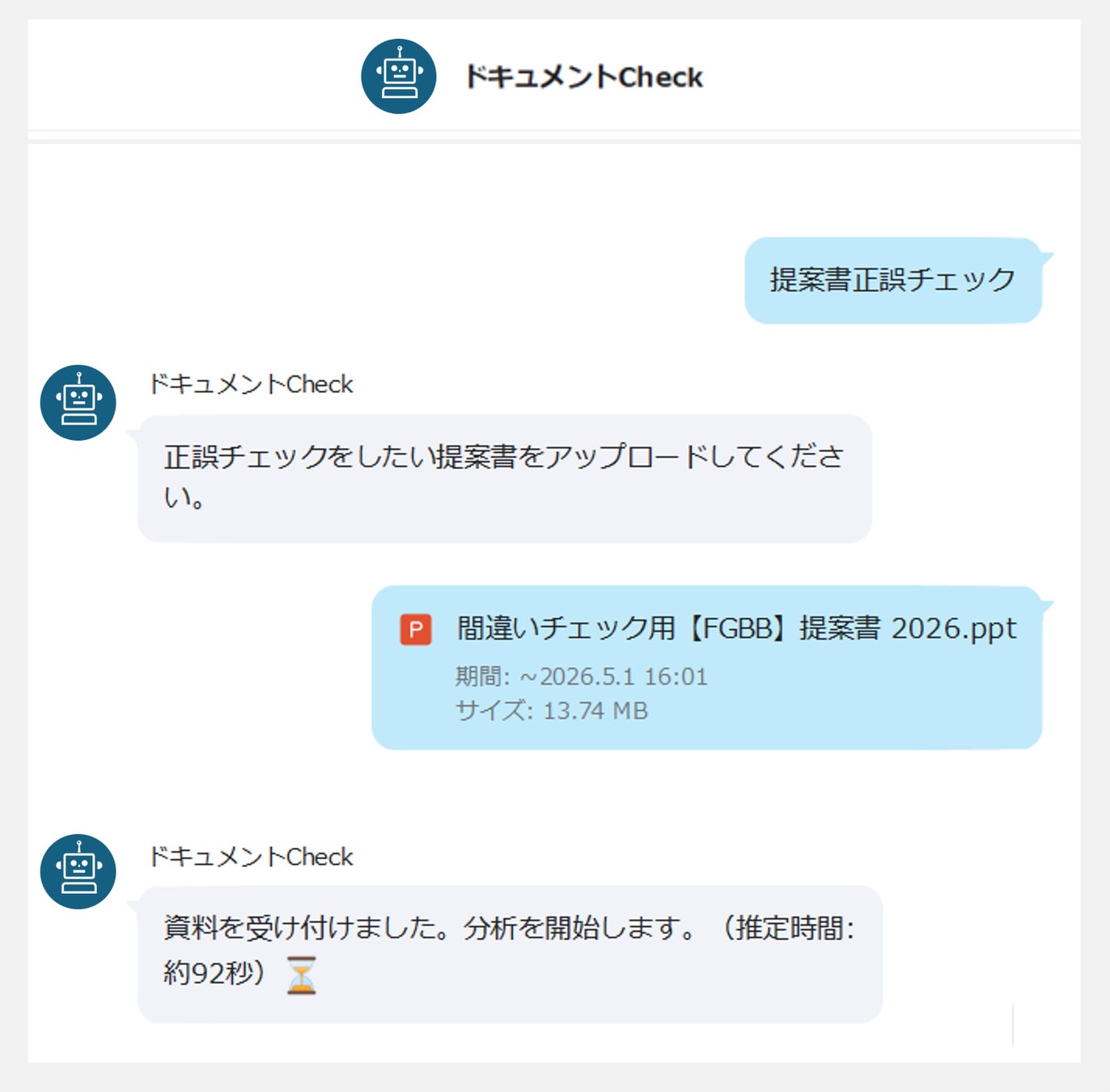 資料を送信後、分析が完了次第トークルームに結果が自動で返信されます。手軽な自己レビューとして活用でき、人の目による最終チェック前の段階で資料の質を高めることで、業務効率の大幅な向上に貢献します。