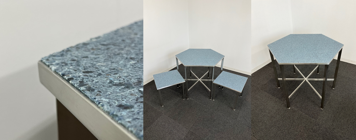 この度、上記プロジェクトの一環として回収していた衣類品の廃材をアップサイクルし、循環型繊維リサイクルボード「PANECO®」により作られたイスやテーブルなどの什器を当施設へ導入いたします。
