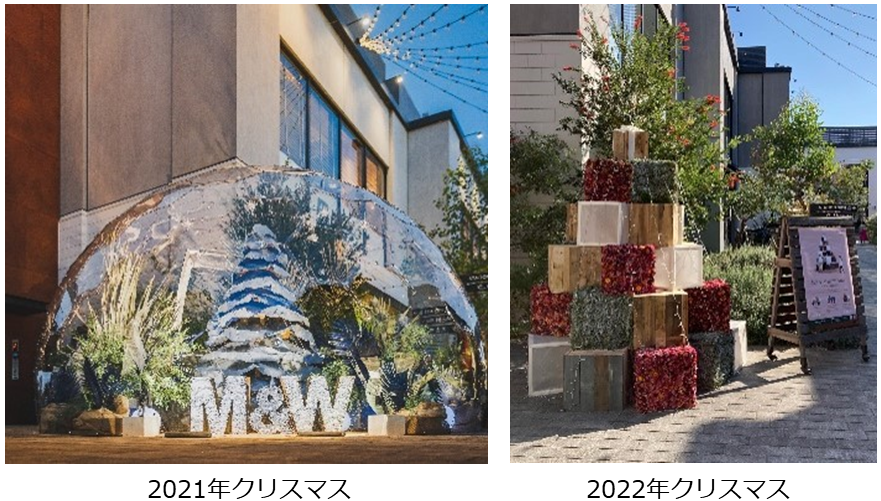 ◆廃材クリスマスツリー当施設では例年サスティナブルを意識したクリスマスを演出しています。2019年、2020年はクリスマスは色とりどりの廃材を使ったオリジナルツリーを製作。ツリーに使用した廃材は解体し、施設のロゴサインとして生まれ変わりました。 2021年には、リサイクルデニムで表現されたクリスマスツリーを主役にしたスノードーム、更に2022年には、ロスフラワーによるクリスマスツリーを展開。ご来館頂いた方に楽しんでいただく演出も“消費”するのではなくサステナビリティを常に意識しています。