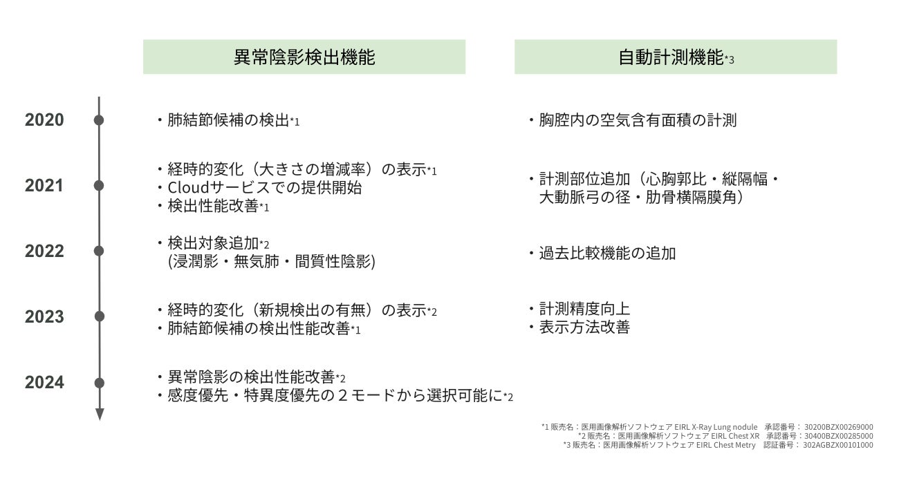 (1)EIRL Chest Screeningは製品の総称です。2022年2月3日:胸部X線画像の読影診断を支援する EIRL Chest Screening、肺結節候補域の検出と5つの計測機能を有する新モデルとして販売開始(https://lpixel.net/news/press-release/2022/10501/)