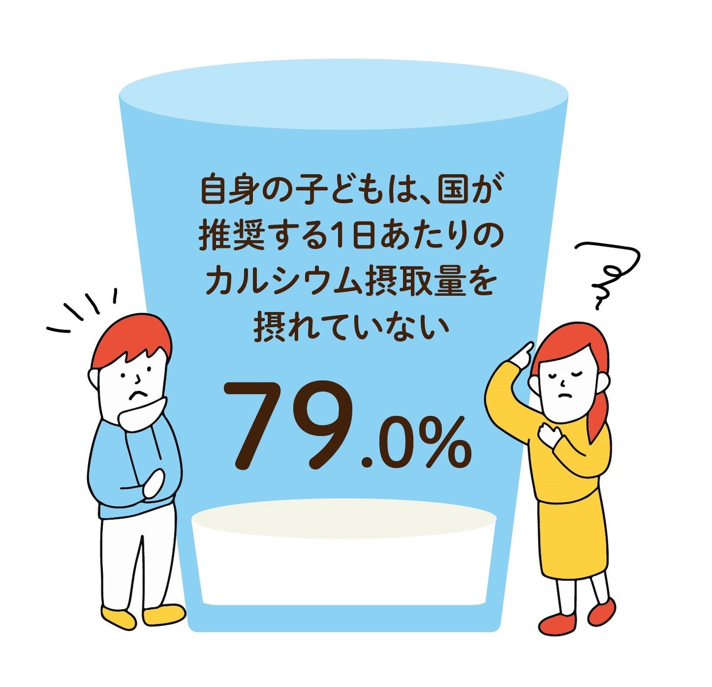 厚生労働省から出ている「栄養素等表示基準値(2015年版/最新)」によると、子供のカルシウム摂取量として1日680mg※が推奨されていますが、今回の調査結果では子供が680mgのカルシウムを「摂れていない」と答えた人が79.0%です。