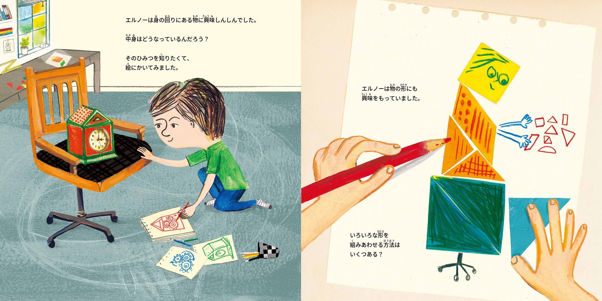 身近な物の絵を描いたり、図形の組みあわせを考えることに夢中でした。