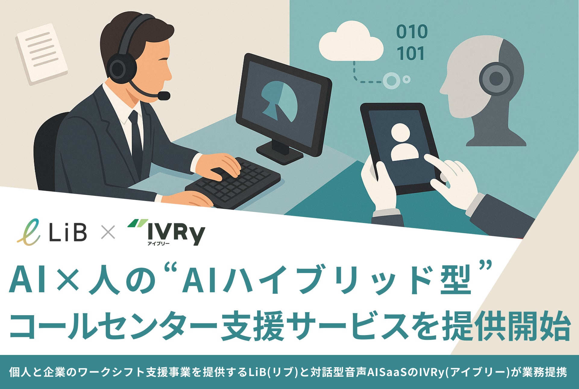 個人と企業のワークシフト支援事業を行う株式会社LiB(所在地:東京都港区 代表取締役:松本 洋介 以下「LiB」)は、 対話型音声AI SaaS「IVRy」を提供する株式会社IVRy(本社:東京都港区 代表取締役/CEO:奥西 亮賀、以下「IVRy」)と、2025年1月に業務提携契約を締結し、コールセンター業務のスキル人材による有人対応と音声AI技術を組み合わせた 「AIハイブリッド型コールセンター支援サービス」 の協働提供を2025年6月に開始いたしました。