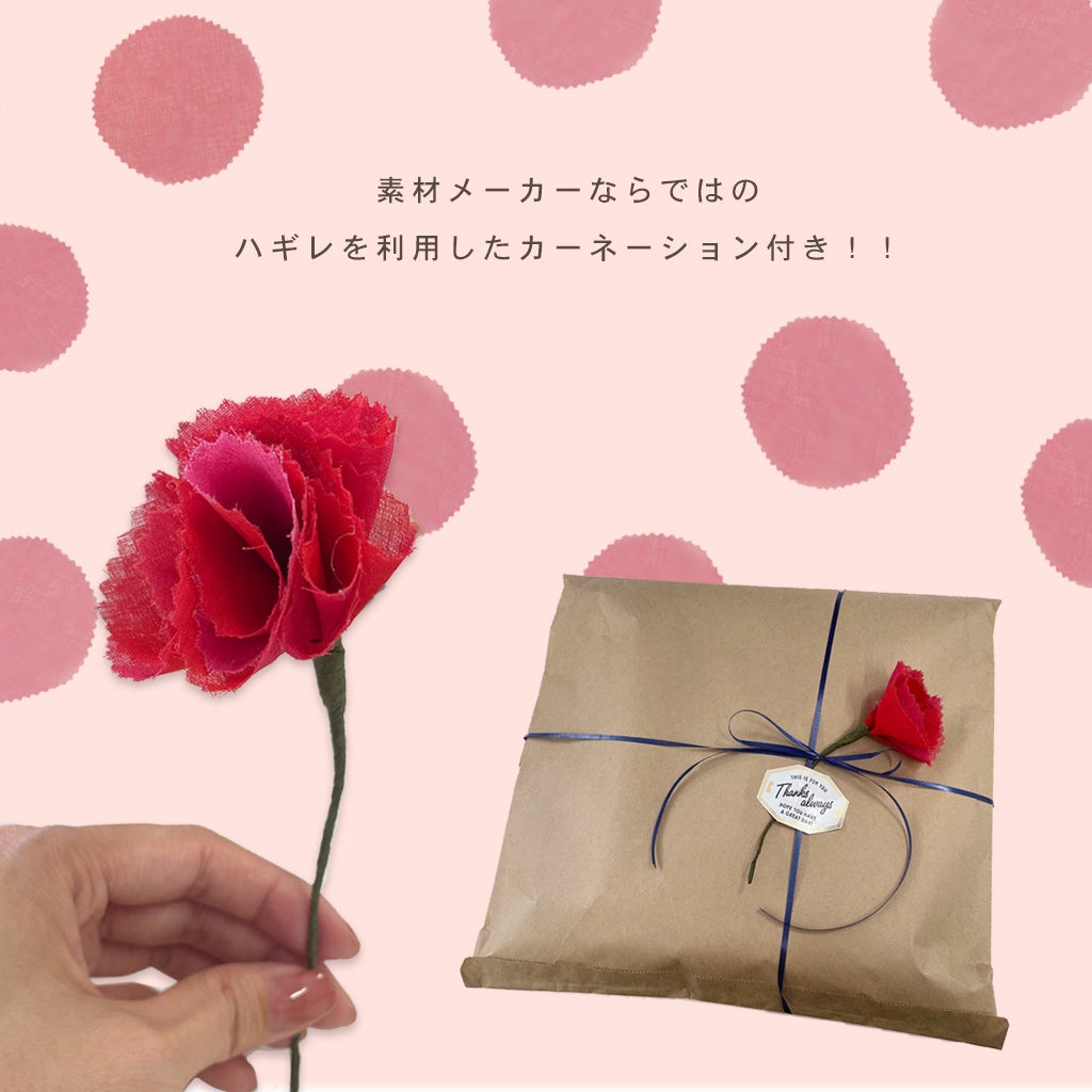 5月14日(日)までの期間中、送料無料キャンペーンを実施しております。また、ハギレを使ったカーネーションがついた、母の日仕様の特別ラッピングも無料で行っております。