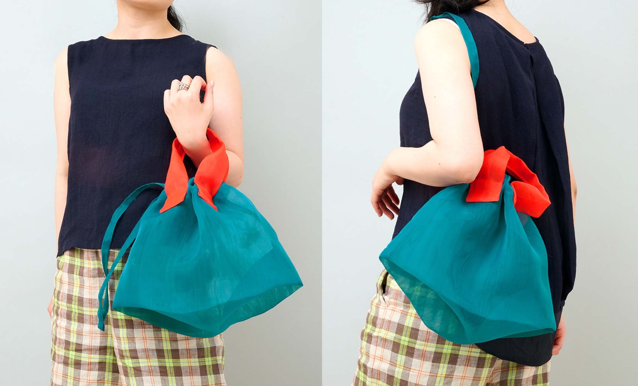 これを染めてバッグにすることで、生地が透けて光沢感があり、工業資材ならではのハリ感がぷくっとしたユニークなシルエットが生まれました。