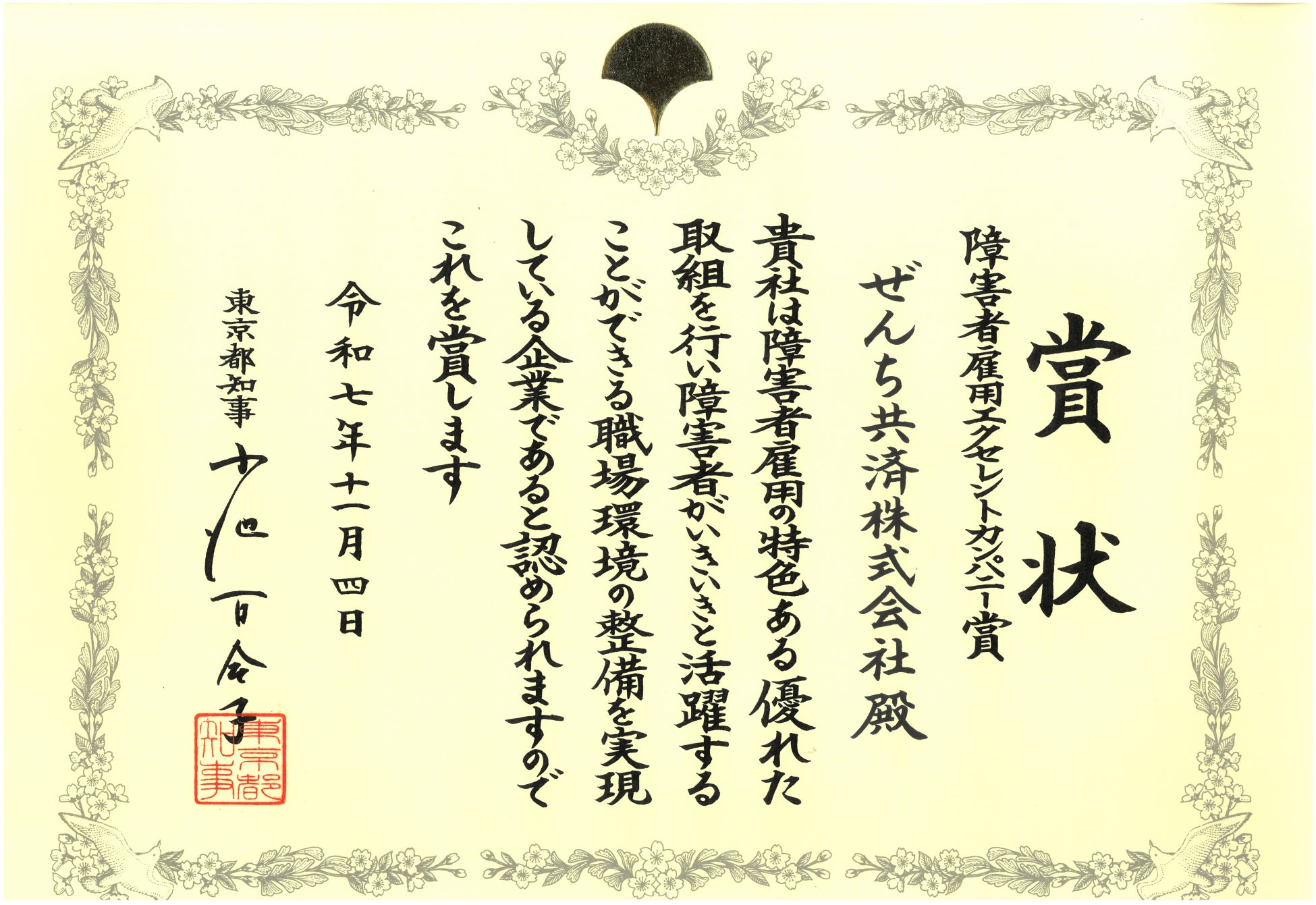 障害者向けの保険を取り扱う専門保険会社、ぜんち共済株式会社(本社:東京都千代田区、代表取締役社長:榎本重秋)は、令和7年度「障害者雇用エクセレントカンパニー賞」にて東京都知事賞を授与されました。