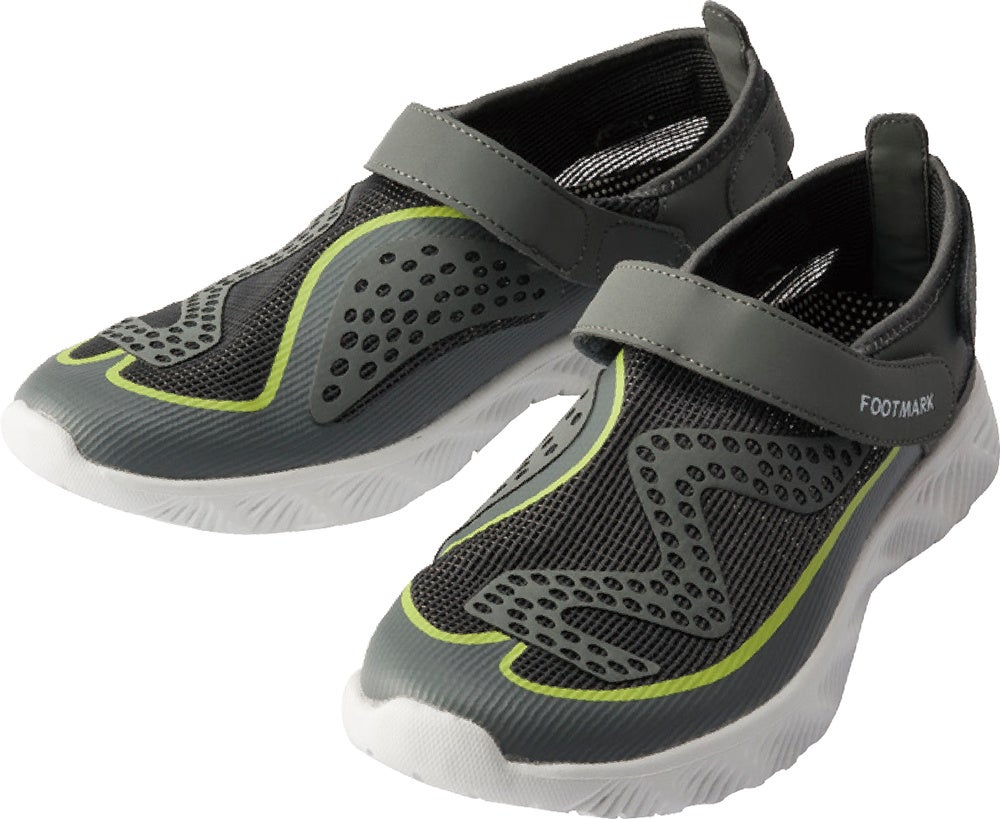 今回のアクアシューズの開発では、底面の特殊な凸凹形状ソールによる足元の安心感にこだわりました。グリップ力を高めることで、1.地面をつかむ・蹴る感覚を得やすくなる 2.体のブレが少なくなり、安定しやすく、疲れにくいため、より良い姿勢で歩くことができるというメリットがあります。また、しっかり足にフィットさせるため、足の甲の部分と踵部分で調整できるように2箇所の面ファスナー付きベルトでサイズ調整ができるようになっています。