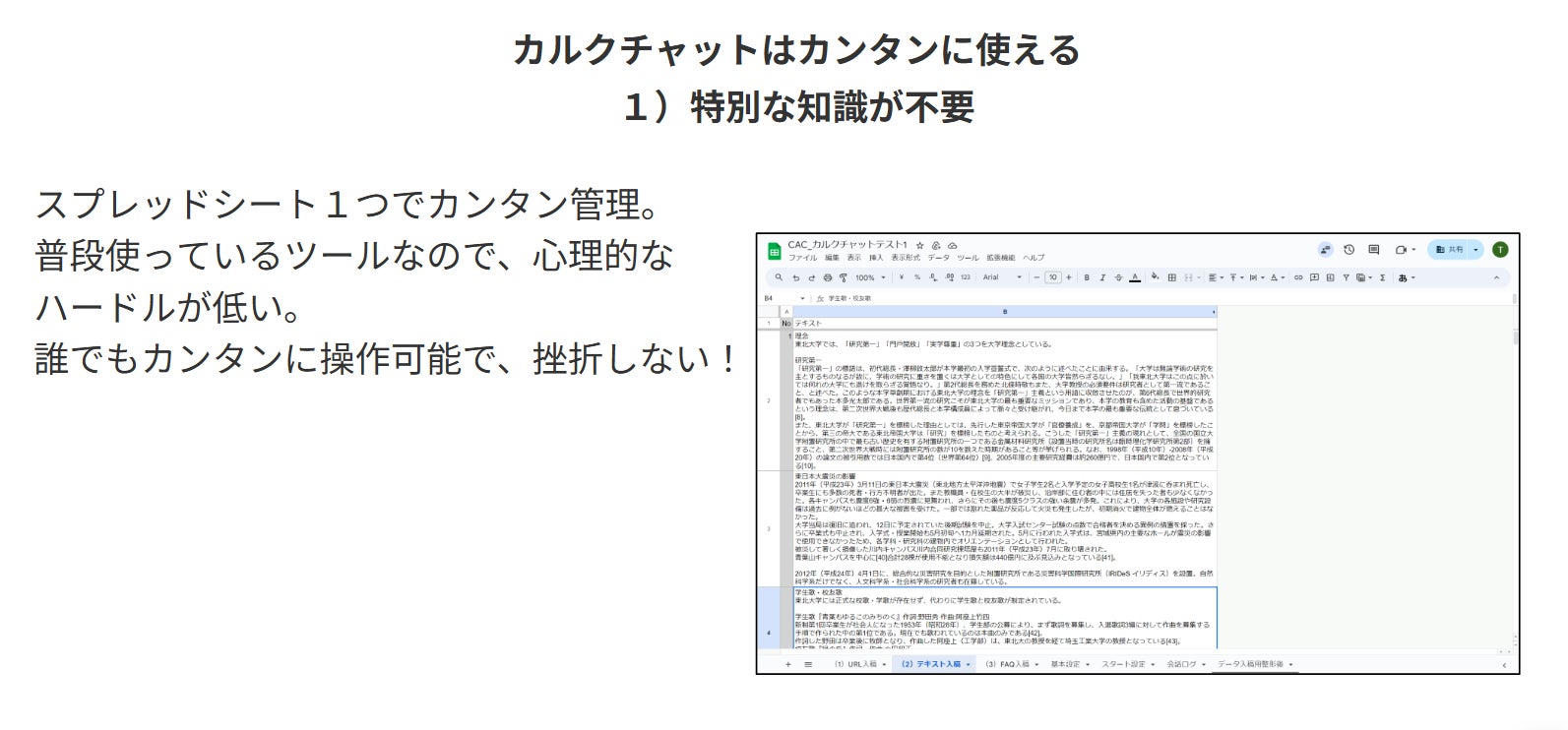 1)特別な知識が不要:カルクチャットは特別な知識を必要とせず、スプレッドシートを使った簡単な管理が可能です。誰でも直感的に操作できるため、導入時の心理的ハードルが低く、挫折しにくい設計となっています。