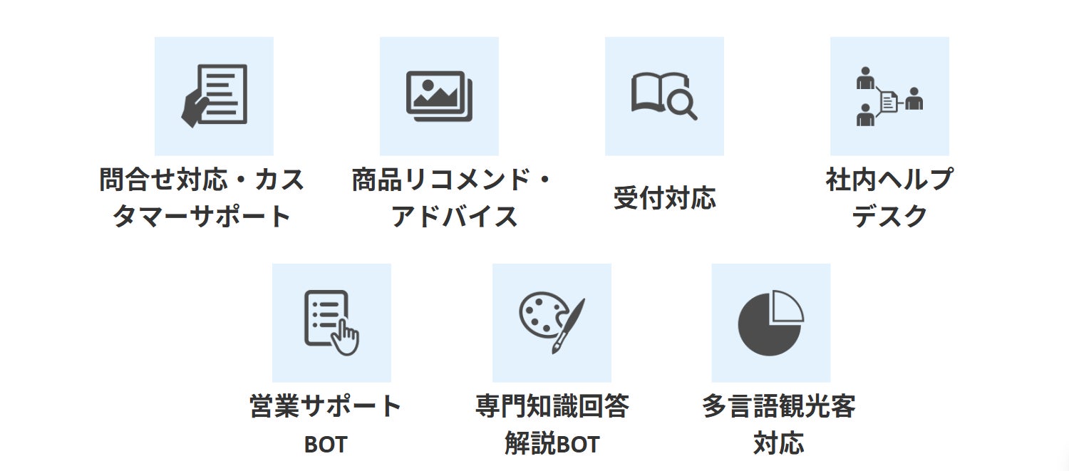 3)多様な用途に対応:問い合わせ対応、商品リコメンド、受付対応、社内ヘルプデスク、営業サポートなど、さまざまな業務に活用できます。