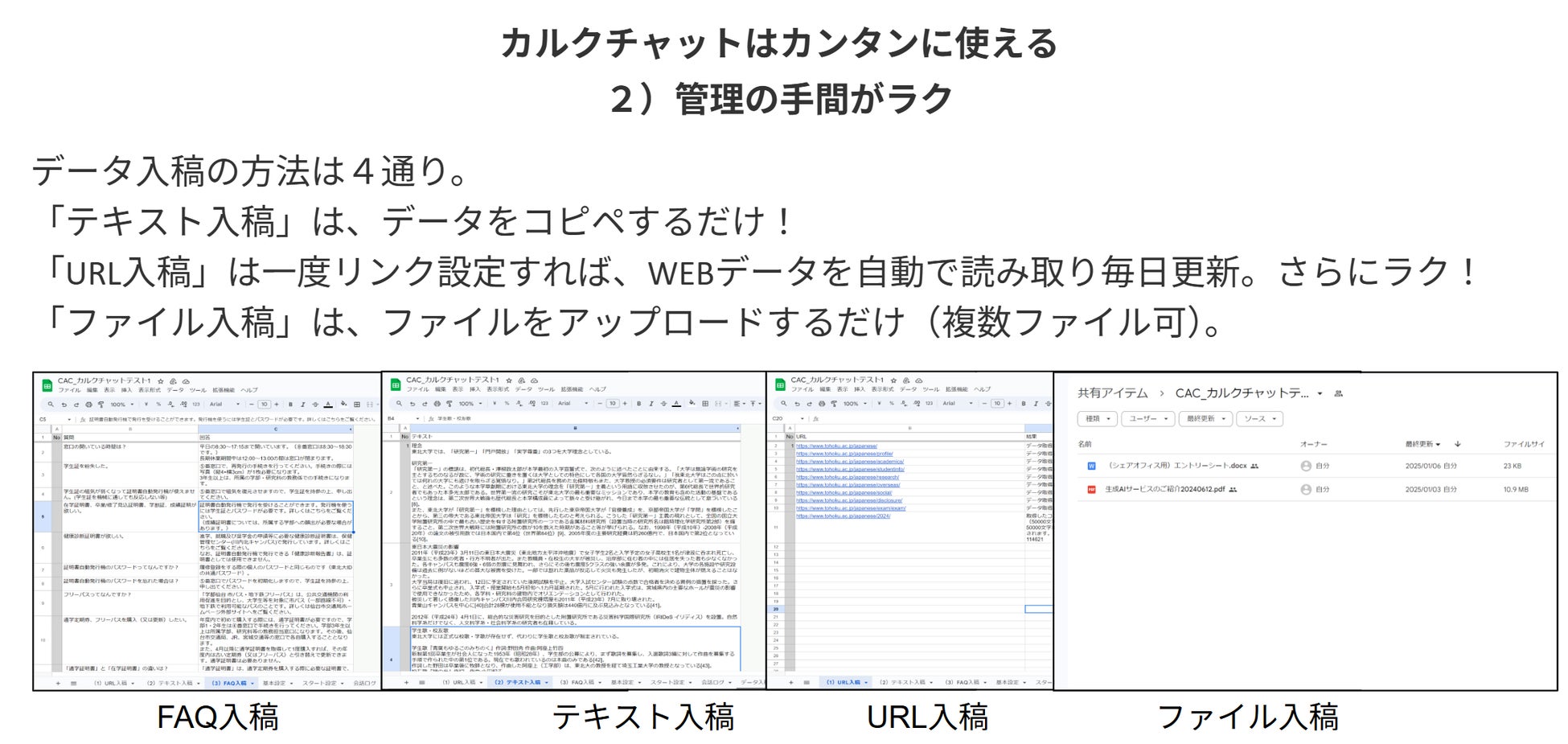 2)管理の手間がラク:カルクチャットは多様な入稿方法を備えており、テキスト、URL、ファイルをアップロードするだけで設定が完了します。これにより、管理の手間を大幅に軽減します。