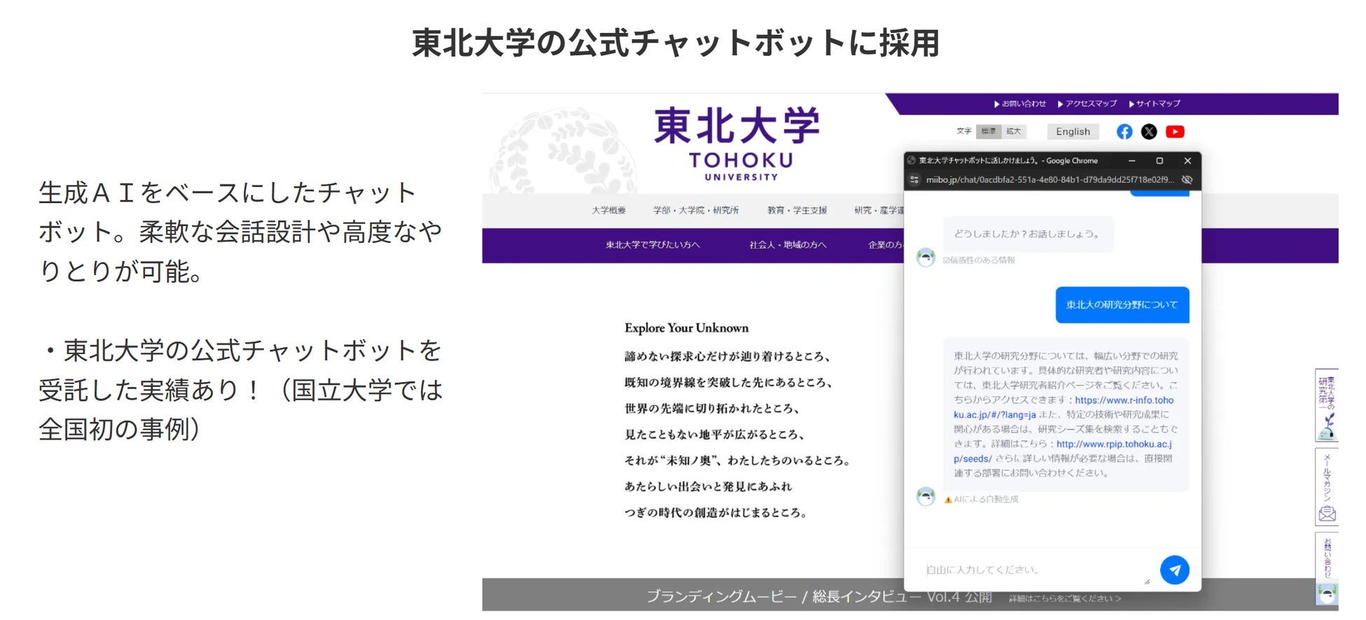7)実績ある信頼性:東北大学の公式チャットボットとして採用されるなど、実績に裏打ちされた信頼性があります。