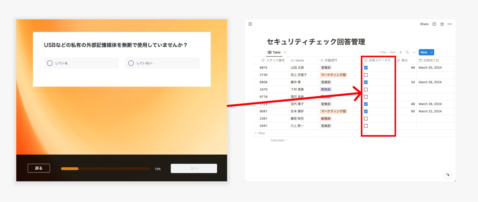 事前に従業員データベースをNotion上に作成しておくことで、フォームの入力値によって回答ステータスを管理したり、回答値をプロパティに上書き更新することでさまざまな社内フォームを柔軟に管理することが可能になります。