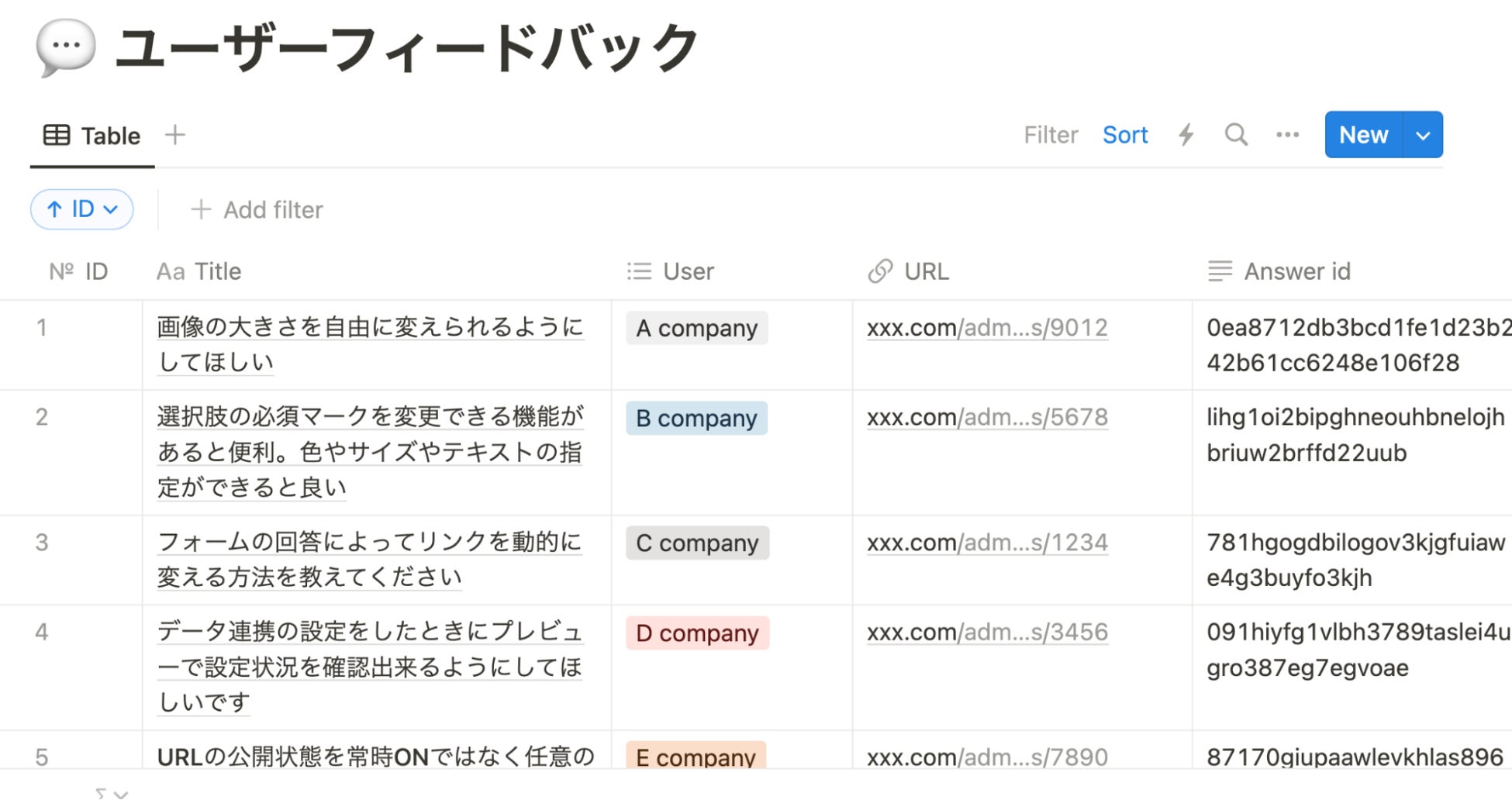 投稿された顧客フィードバックをNotionのデータベースに連携することで、メンバー間に情報が共有され、改善アクションを進めることが可能です。