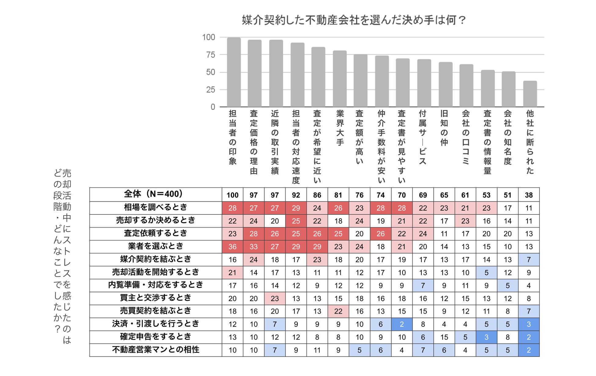 興味深いのは、売却プロセスの初期段階でストレスを感じた人は、『業界大手』や『査定額が希望価格に近い』を主な決め手とする傾向が見られました。