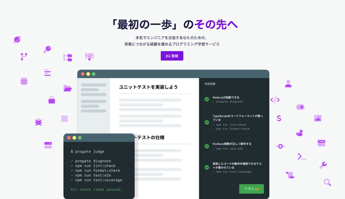株式会社Progate(本社:東京都渋谷区、代表:加藤將倫、以下Progate)は、実務に近い学びを得られる最新プログラミング学習サービス「Progate Path」の2022年内公開にあたり、品質向上を目的としたクローズドβテストを実施いたします。本日、「Progate Path(β版)」サイトを公開し、βテスターの募集を開始したことをお知らせいたします。