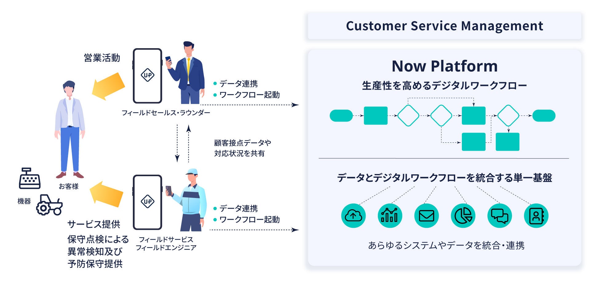 今回、フィールド業務から収集される顧客接点データを活かすプラットフォームとして、ServiceNowが提供する「Now Platform」、及び「カスタマーサービスマネジメント(CSM)」のフレームワークに機会を見出し、従来のCRM領域を越えて、日常的に顧客と接触するセールスパーソン、市場調査を行うラウンダー、保守メンテナンスを行うフィールドサービス業務を対象として、「UPWARD」の価値をより効果的に届けるべく、パートナーシップ契約を締結しました。
