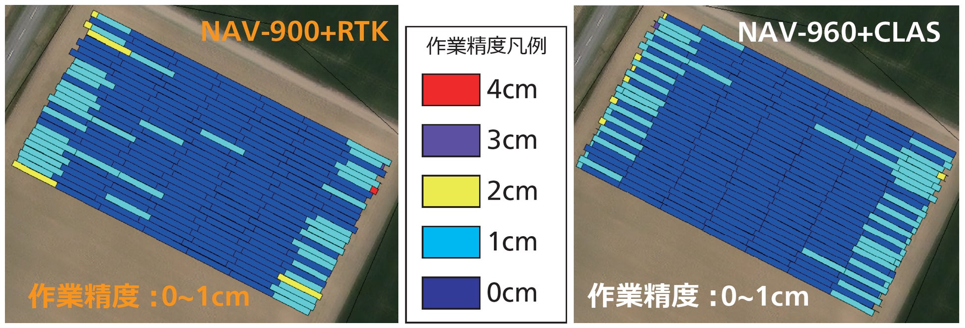 CLAS測位時のGFXシリーズを、ほ場で走行させた際の作業精度(※) は数センチメートルを実現しました。既存製品でRTKを用いた自動操舵時の作業精度と比較しても遜色はありません。