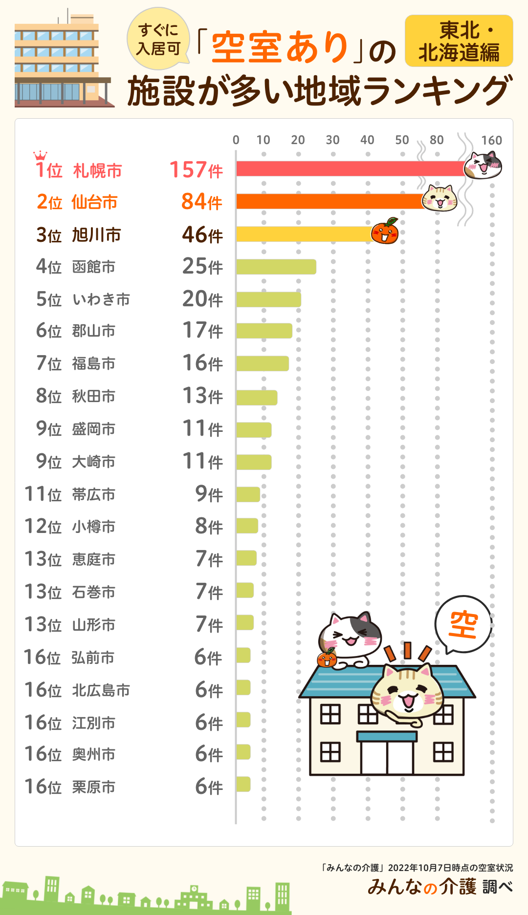 【みんなの介護】「空室あり」の老人ホームが多い地域ランキング 【2022年10月・東北・北海道編】
