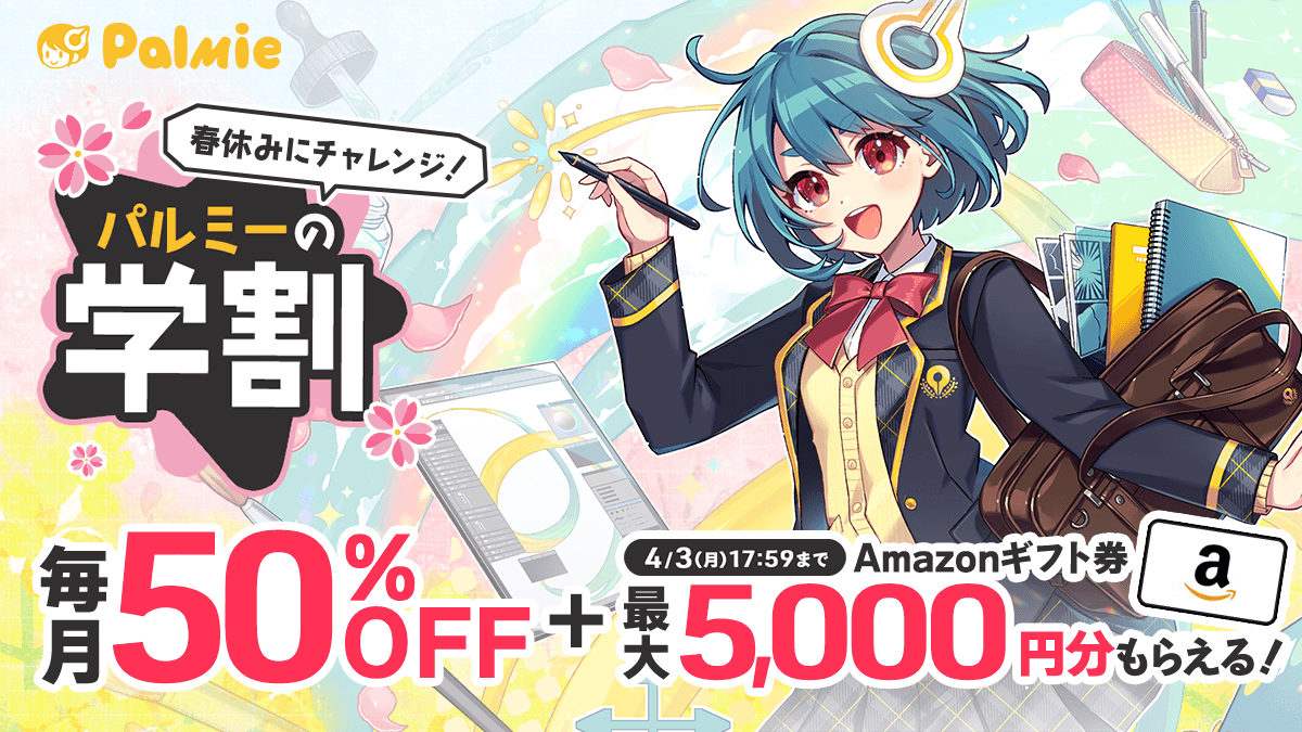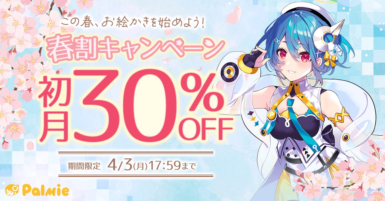 株式会社パルミー(所在地:東京都港区、代表取締役:伊藤貴広、以下パルミー)は、本日2023年3月20日(月)12時00分から2023年4月3日(月)17時59分までの期間、受講料が初月30%OFFになる『春割キャンペーン』を開催いたします。また、学生限定でAmazonギフト券最大5,000円分をプレゼントする『学生応援キャンペーン』も開催中!春休みはパルミーでイラストを学びませんか?