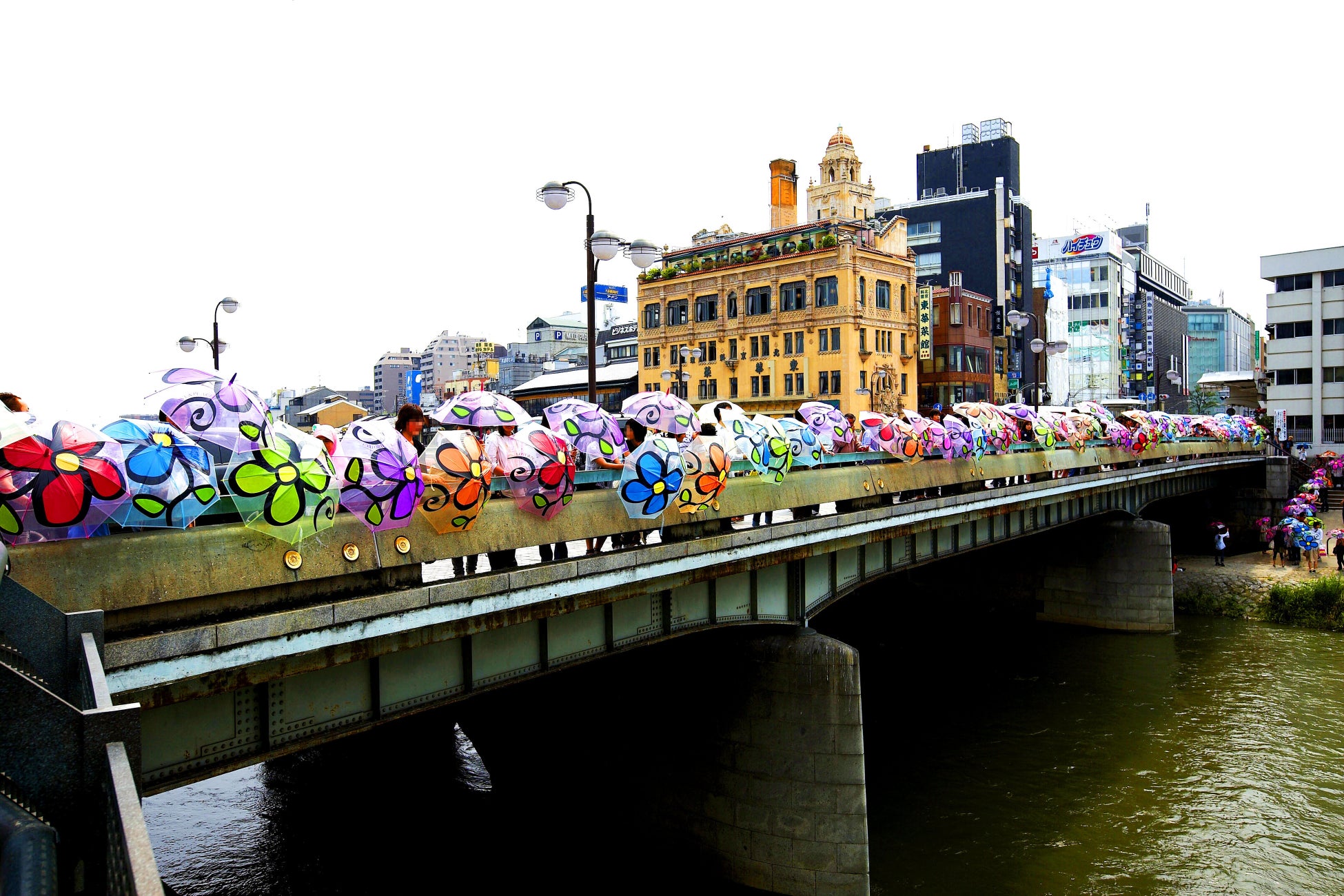 2007年、1995年ボストン在住時に構想した使い捨てビニール傘に花のペイントをして街で一斉に開き街を花で埋め尽くす作品