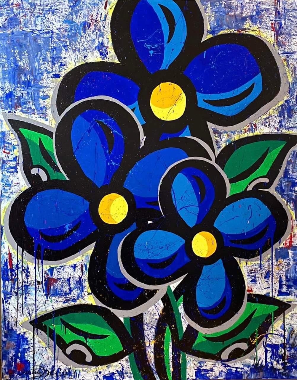 描く花は花瓶に飾られる花ではなく、大地に咲く花をイメージしてキャンバスの下から上へ大胆に描く。それは自然の美しさや生命力を讃え、その力強さを表現したいという思いからです。