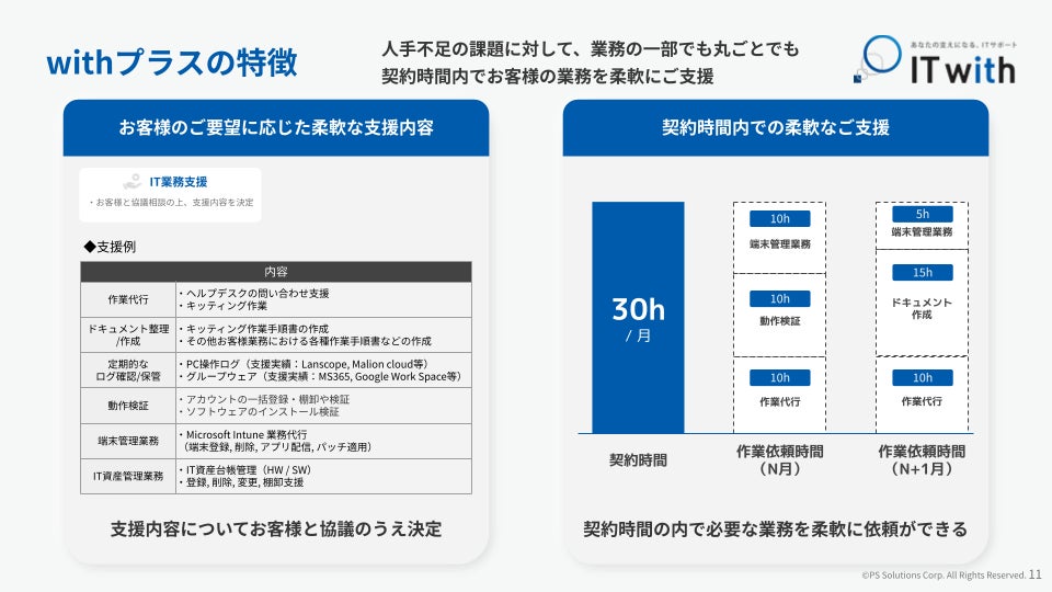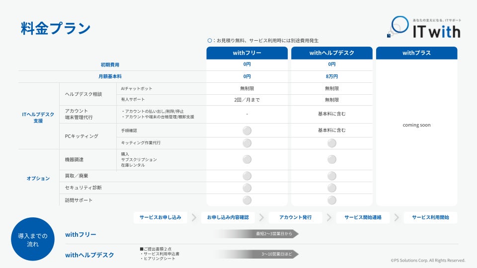 PSソリューションズ株式会社(本社:東京都港区、代表取締役社長:村松佑樹)は、中小企業向けITサポートサービス「IT with」を2024年2月15日から提供開始し、約4カ月で、導入社数が1,000社を突破したことをお知らせいたします。