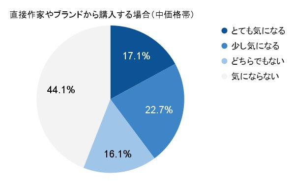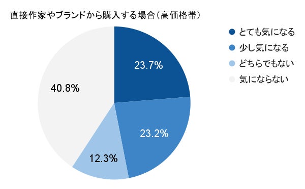 価格帯に関わらず、二次流通(中古市場やその他の購入経路)では95%前後の方が「とても気になる」または「気になる」を選択しました。一方で、一次流通(作家・ブランドからの直接購入)になるとその値が半減し40-50%となり、作家・ブランドなど作り手から直接購入できるか否かがユーザーのリスク感覚に大きく影響していることがわかりました。
