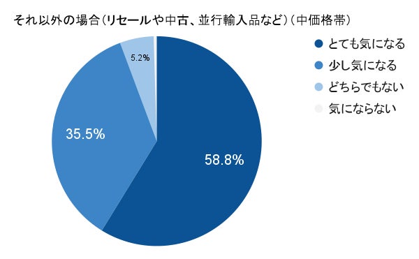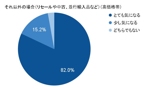 価格帯による関心度の違いは一次流通においてはほとんど見られませんでした。一方二次流通に関しては、高価格帯において「とても気になる」の割合が82%となり、中価格帯の59%よりも極めて高い結果となりました。