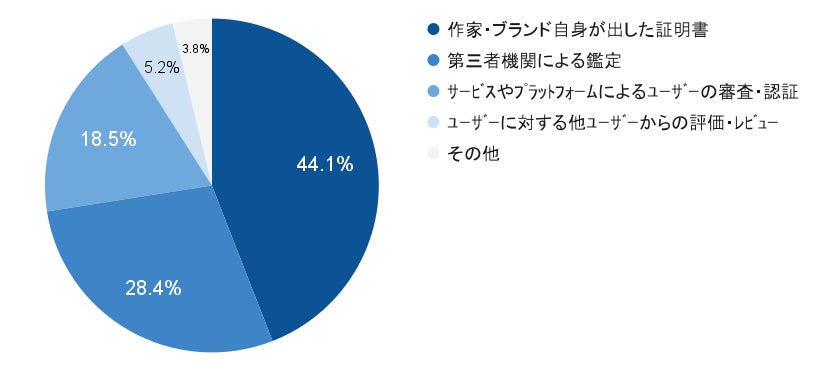 「作家・ブランド自身が出した証明書」が最も多く45%、続いて「第三者機関による鑑定」 が28%。「サービスやプラットフォームによるユーザーの審査・認証」と「ユーザーに対する他ユーザーからの評価・レビュー」は合わせても24%と低い結果となりました。作家やブランドなどの作り手による証明・認証を求めているユーザーが多いことがわかりました。
