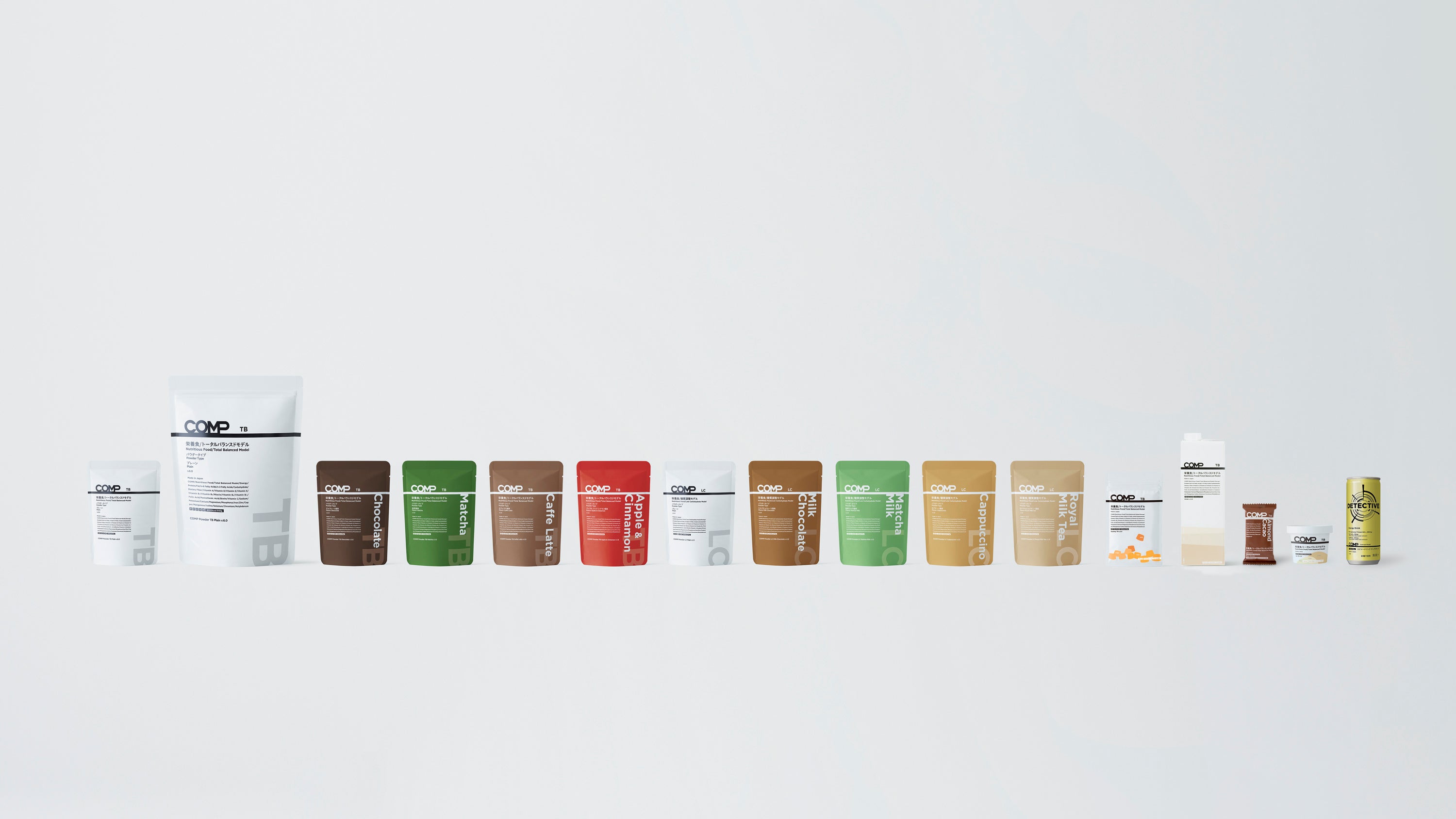 COMPは場面ごとに最適な栄養摂取を、厳密に設計された製品の開発によって提案し続ける栄養食ブランドです。厚生労働省「日本人の食事摂取基準(2020年版)」を参考に「完全食」「完全栄養食」をコンセプト*としたトータルバランスドモデル(TB)、食事において摂取する糖質量の調整を容易にする糖質調整モデル(LC)、エナジーバーやエナジードリンクなどの特定の課題解決を目指すためのコンセプトモデル(C)の栄養モデルをご用意。パウダー、グミ、ドリンク、バー・ブロック、アイス等、幅広いアプリケーション展開を実現する開発力も特徴です。