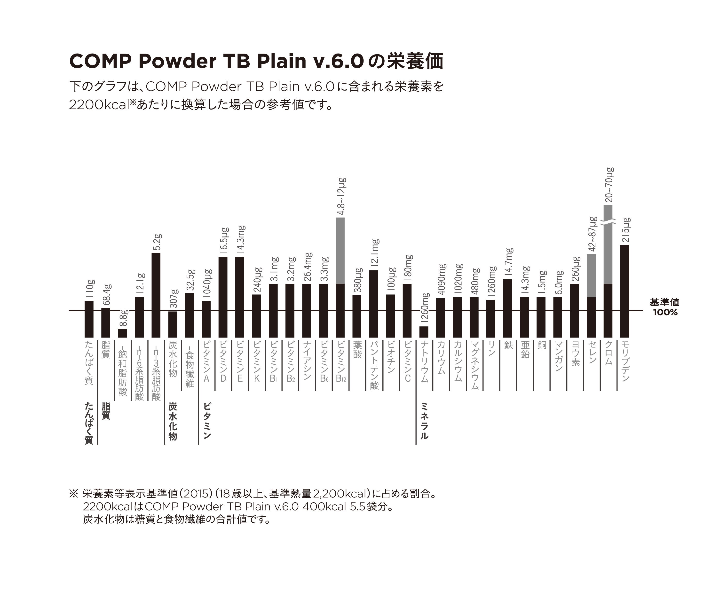 『COMP Powder TB』は「日本人の食事摂取基準(2020年版)」を参考に、三大栄養素「Protein(たんぱく質)」「Fat(脂質)」「Carbohydrate(炭水化物)」とビタミン・ミネラルをバランス良く含んだ栄養食/トータルバランスドモデルです。